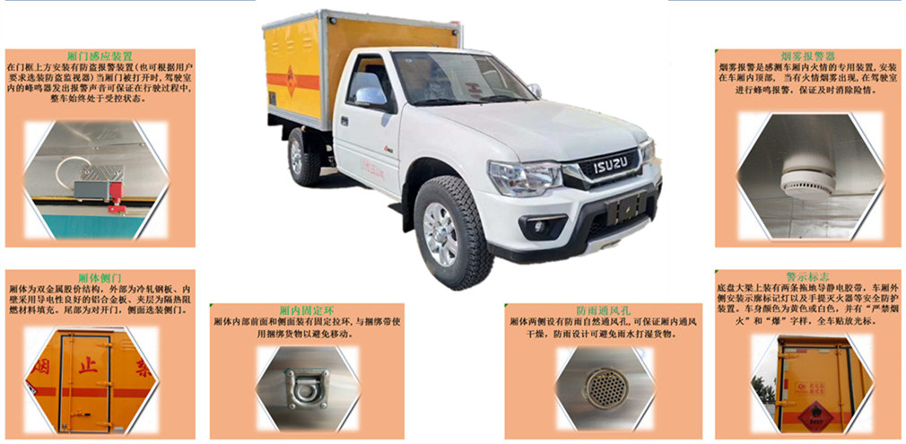 爆破器材車又名炸藥運輸車,雷管運輸車,防爆車,民爆車,煙花爆竹運輸車。它是根據國家有關部委對爆破器材運輸的規范和用戶的要求而研制生產,產品符合國防科工委關于《爆破器材運輸車安全技術條件》的要求。具有廂體強度高、防火阻燃、防雨、防止靜電火花、煙火報警和防盜報警等主要功能。