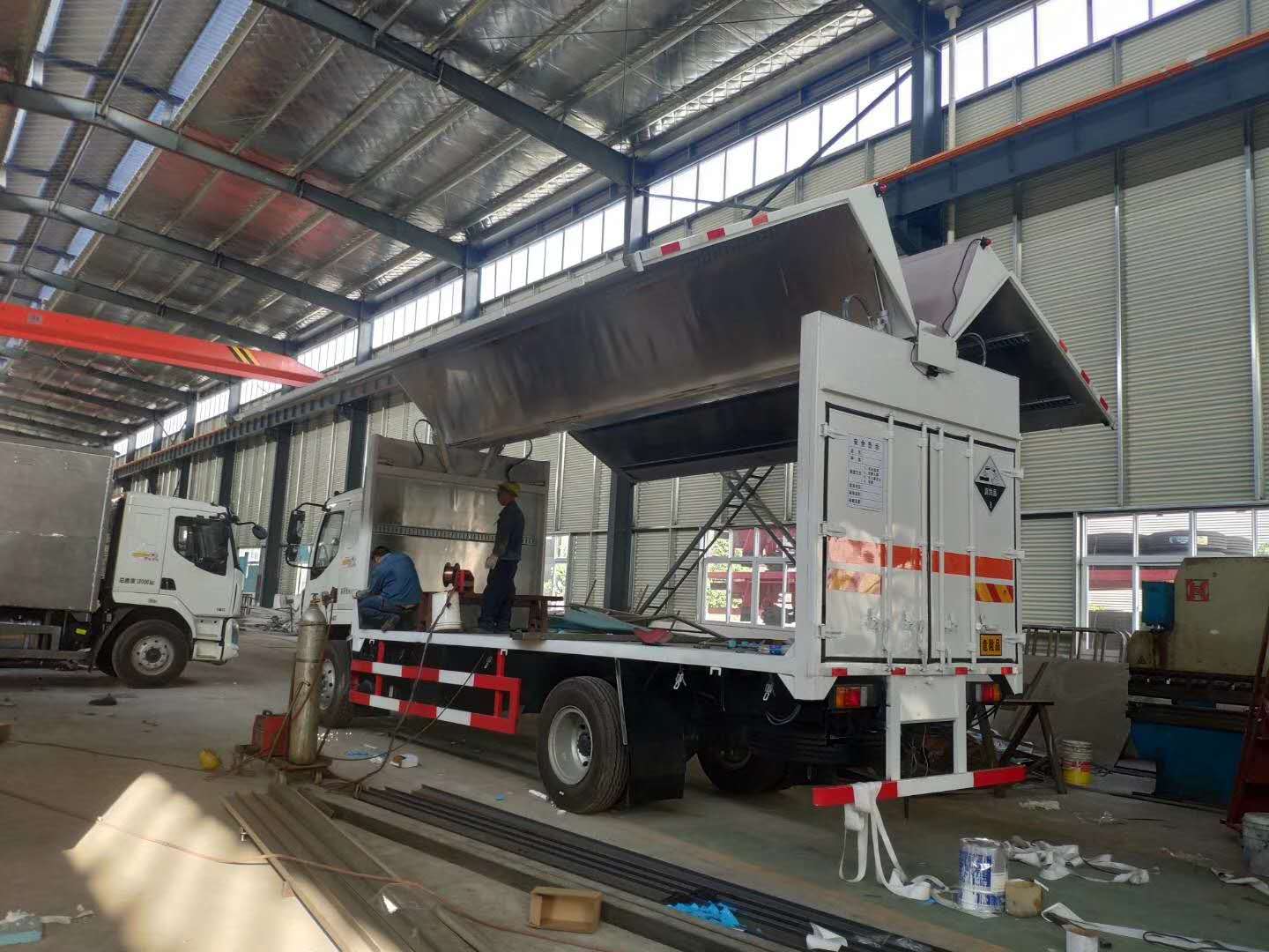 2)上裝配置:外板采用1.2MM厚冷軋板有一次沖壓成型的百葉窗,內飾為導電性能良好的鋁板有透氣孔,內襯為矩形管骨架牢靠穩定,內部填充為透氣防潮阻燃的擠塑板,四種材料經過現代工藝復合而成。內部有固定貨物的防撞護板,該車配有車載專用煙霧報警器及后門防盜器,配有液體收集箱及液位報警裝置,有靜電帶、滅火器、防火罩。整車國標反光標示及警告標志。