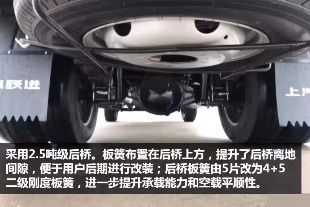 ※國六增加副板簧,且板簧厚度全部為加強型,提高了承載能力。,國六板簧同時更換了布局,后板簧布置在后橋上方,提高了后橋的離地間隙,提高底盤的通過性。