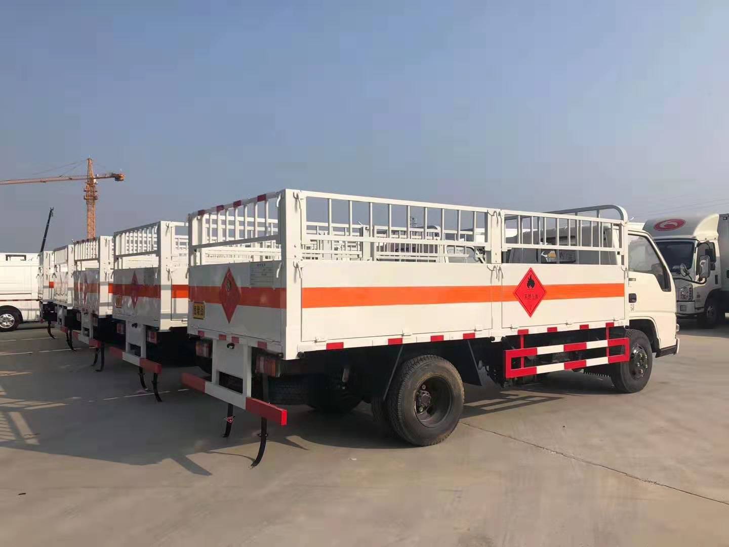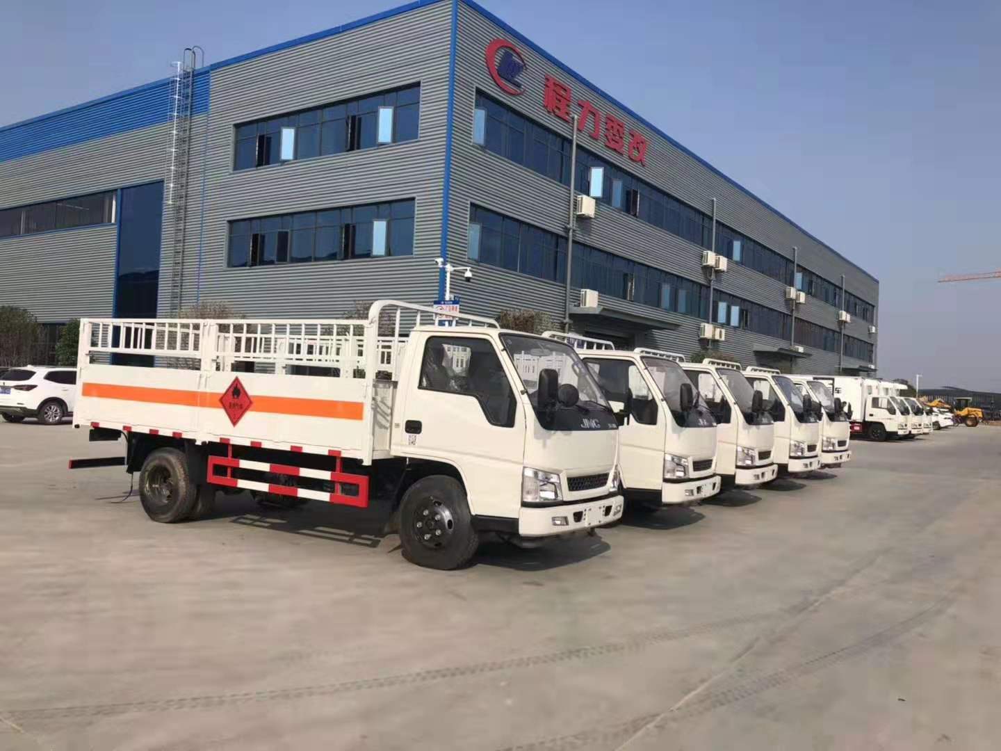 山東徐總因業務需求在我司批量訂購了五臺江鈴4.1米氣瓶運輸車,該車采用江鈴原廠危險品車底盤,3360mm軸距、JX493ZLQ4江西五十鈴發動機(108馬力)、7.0鋼絲輪胎、助力、油剎、148車架、1.5噸前橋/3.3噸級后橋、12伏單電瓶、前置排氣管、貨廂尺寸為4200X1850X1730(mm),邊板對折四開門、外板采用1.2MM厚冷軋板,內襯為矩形管骨架牢靠穩定,底板為3mm厚花紋板,有靜電帶、滅火器、防火罩。整車國標反光標示及警告標志;目前車輛已做好,以下是具體實拍圖片: