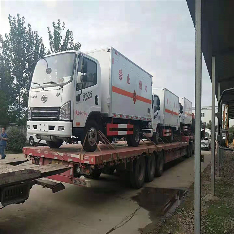 河北郭總因公司業務發展在我司采購了6臺解放虎V爆破器材運輸車,為了讓運輸費用更劃算,郭總選擇了用半掛板車進行車輛運輸,以下是具體實拍圖片: