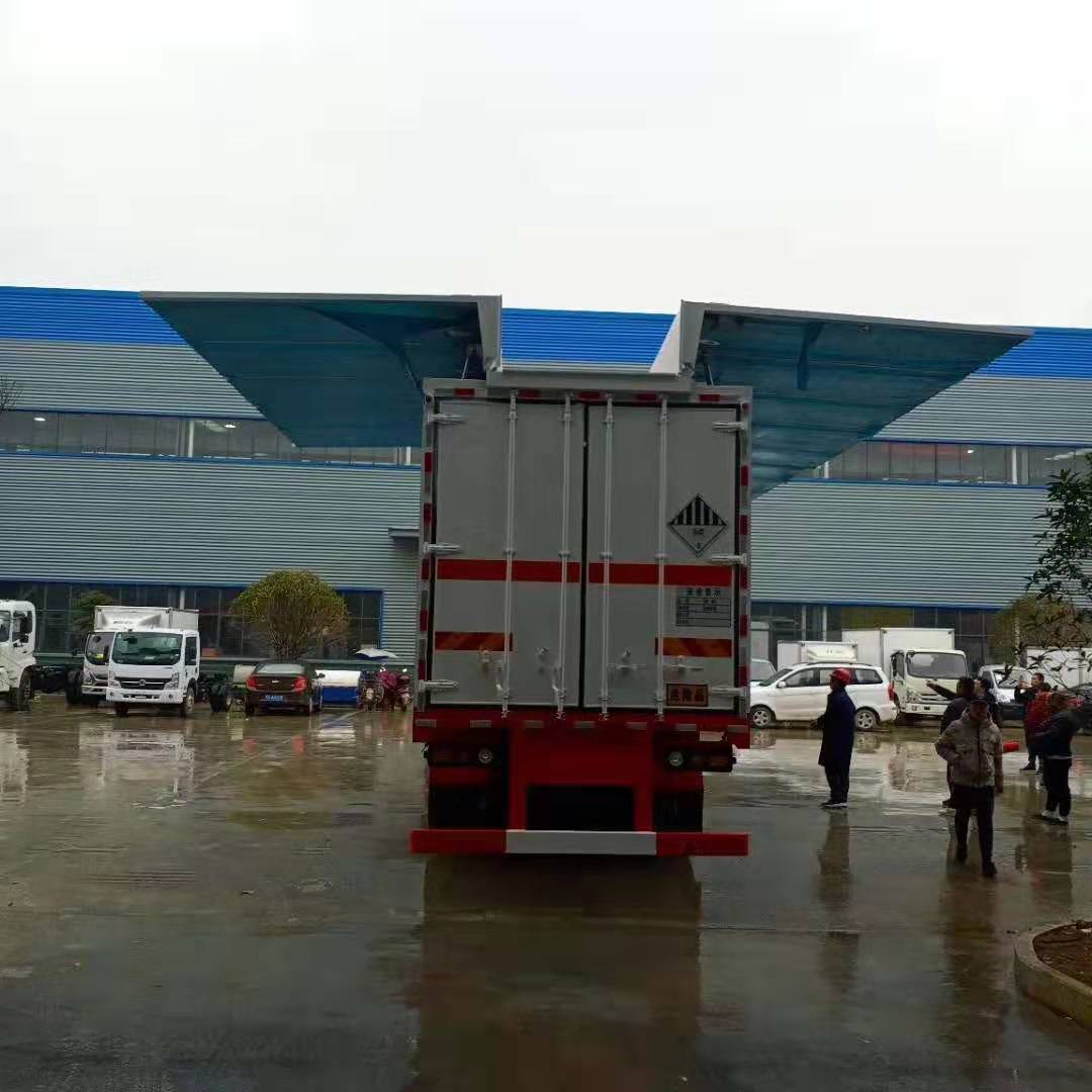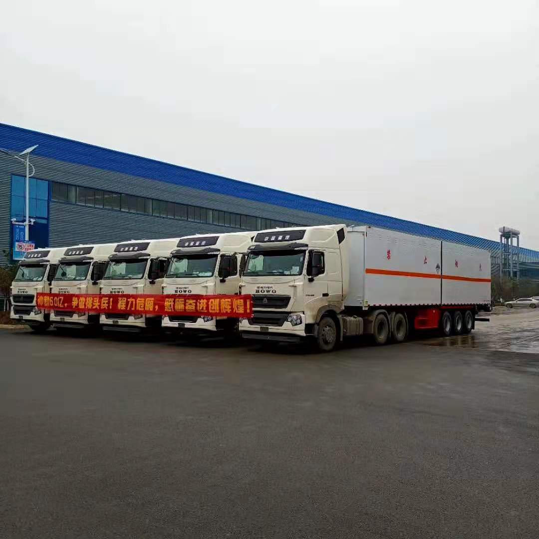 半掛翼展危險品車采用歐式飛翼廂體,5臺九類雜項危險物品廂式運輸半掛車吉時發車,歐式飛翼廂體,底板為花紋板外鋪防靜電膠皮、側板四周頂部加透氣孔、貨廂尺寸:10600×2430×2400/12400×2430,2360×2400,2000、外冷軋鋼板或碳鋼板制作、內鋁板、中間5mm厚阻燃泡沫、箱體底稅鋪有1公分厚的防靜電膠皮、側板安裝2排固定貨物的臥環、箱內頂部安裝LED照明燈和煙霧報警器、防盜報警器、滅火器、駕駛室危險警示燈、防火帽、后雙開門。