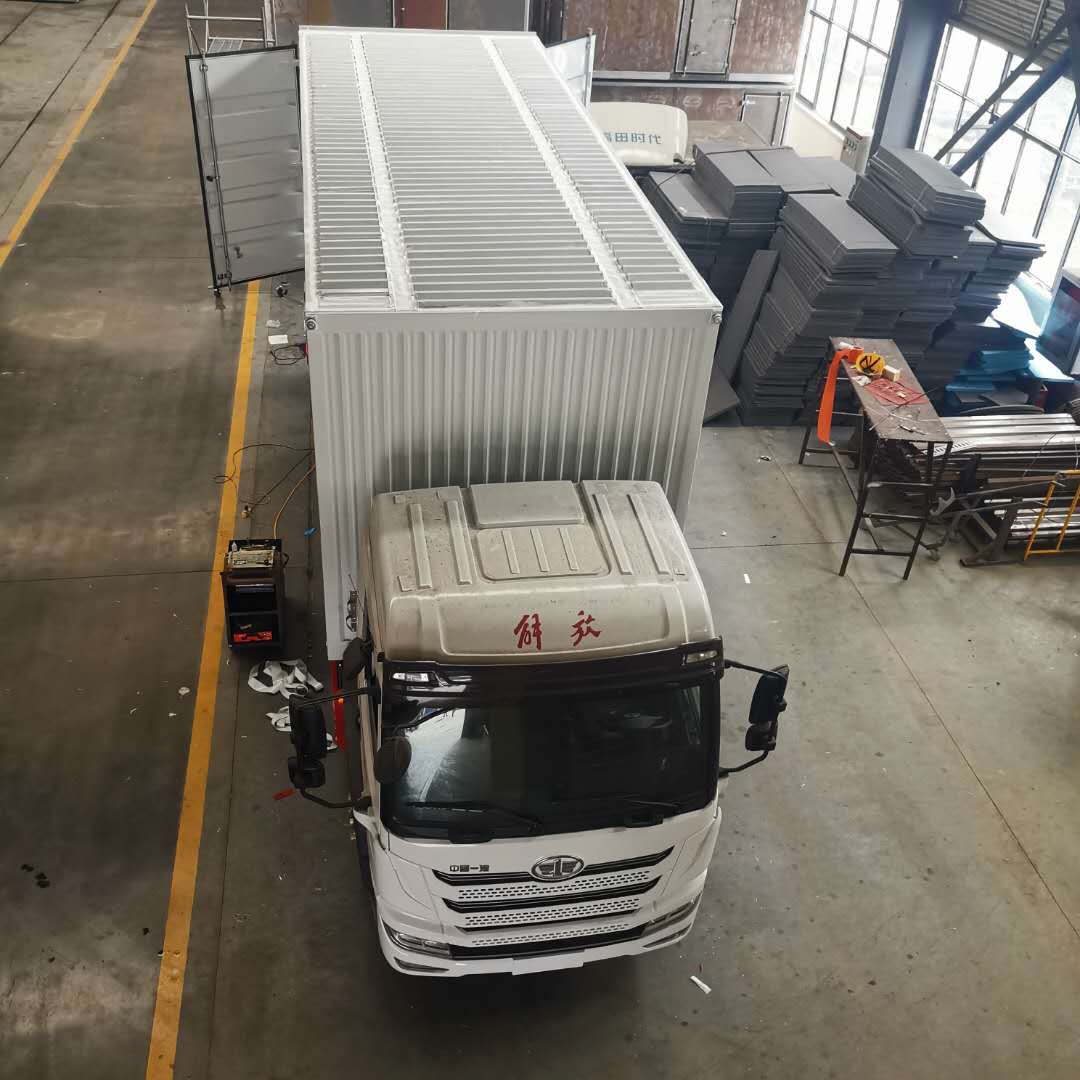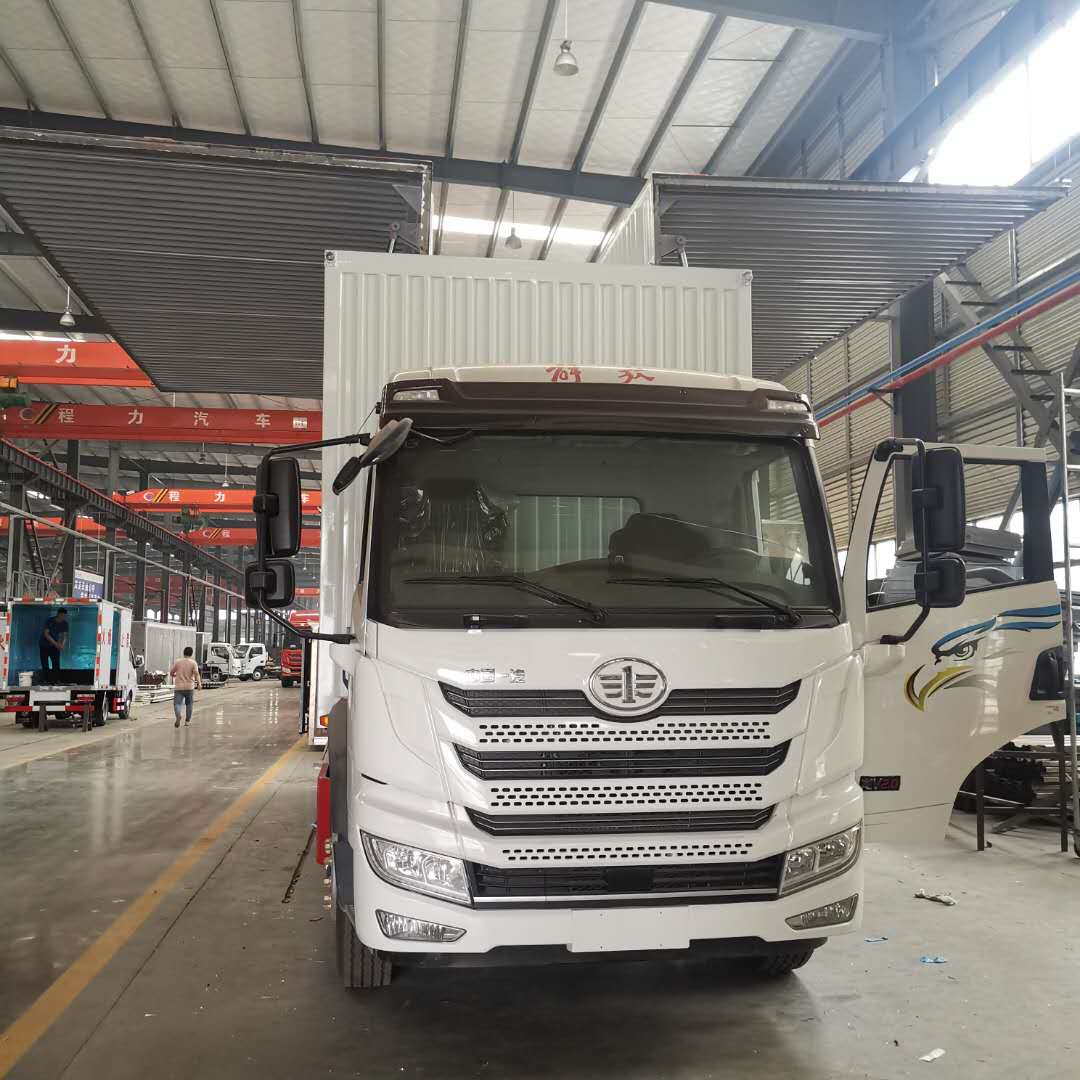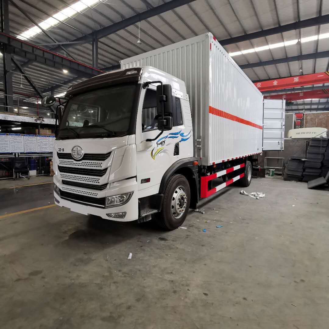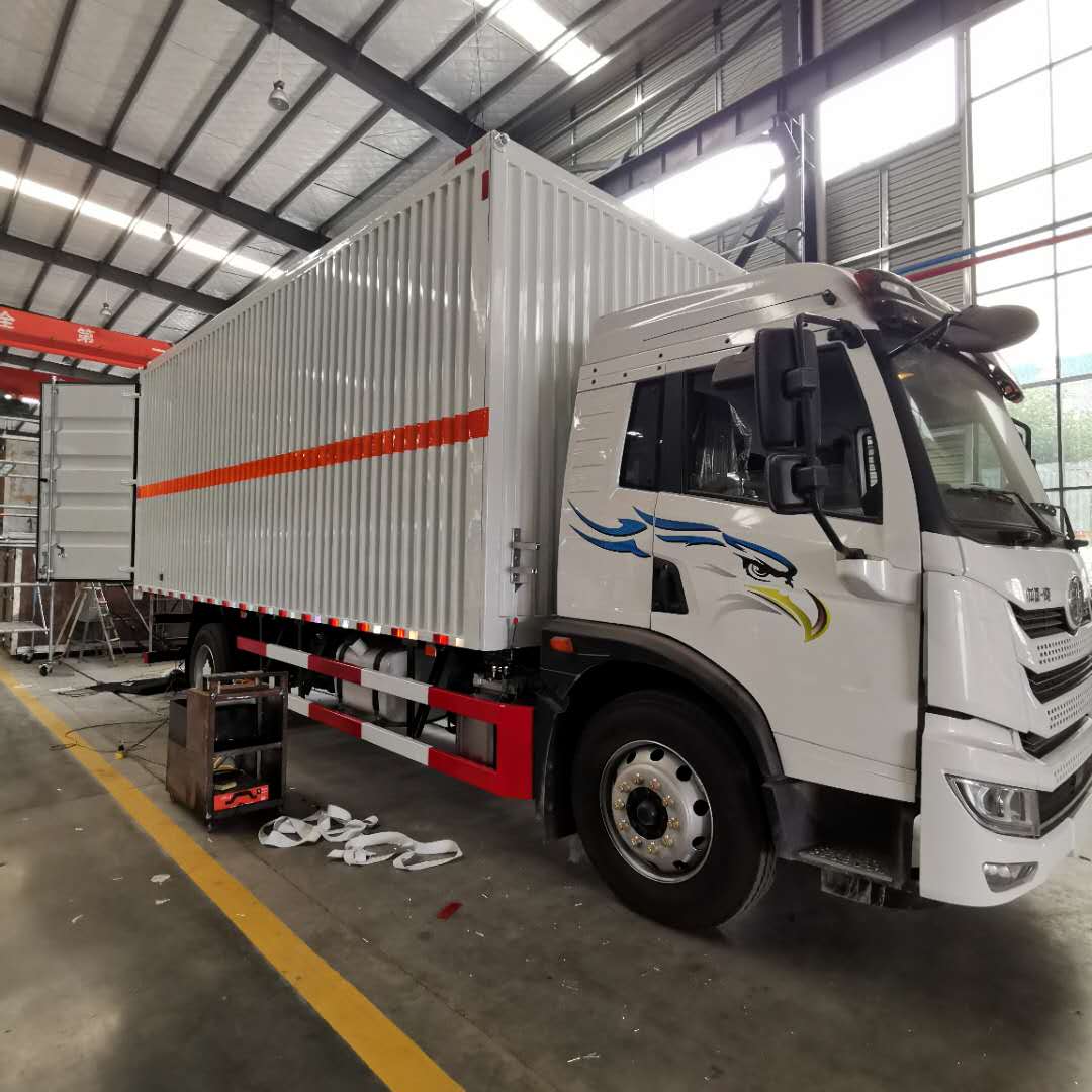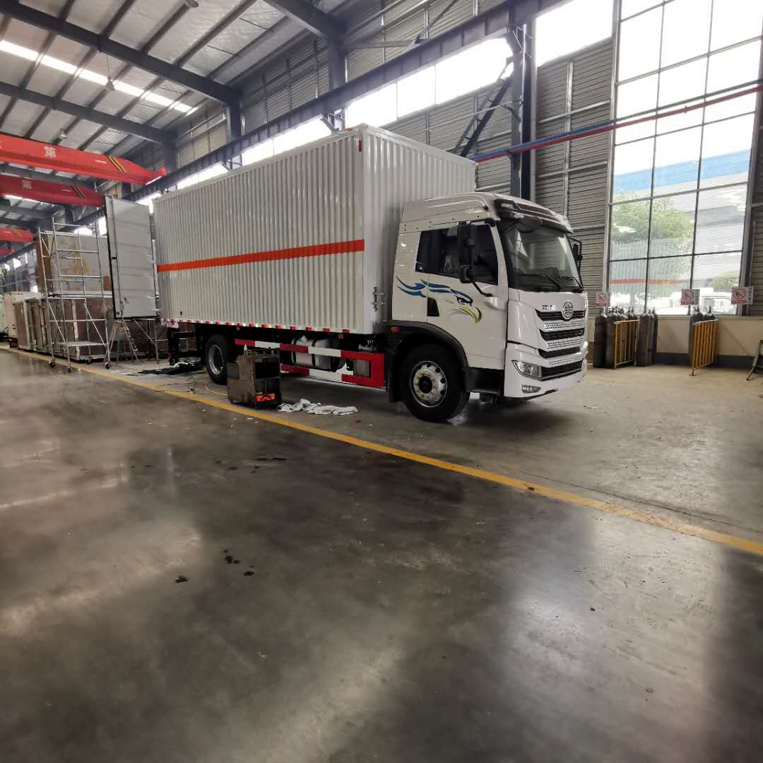 解放龍V翼展式危險品車嚴格按照公告尺寸制作,外板采用1mm厚冷軋板有一次性成型的百葉窗,內飾為導電性能良好的鋁板有透氣孔,內襯為矩形管骨架牢靠穩定,內部填充為透氣防潮阻燃的擠塑板,四種材料經現代工藝復合而成,廂體外部上下鋁合金型材包邊,底板和車廂前下部鋪橡膠皮,后門雙開,右側三個雙開門,內部有固定貨物的臥環,車輛外部有靜電帶、滅火器、防火罩,車廂內安裝煙霧報警器和門防盜報警器,嚴格按照國家危險品相關法規張貼。