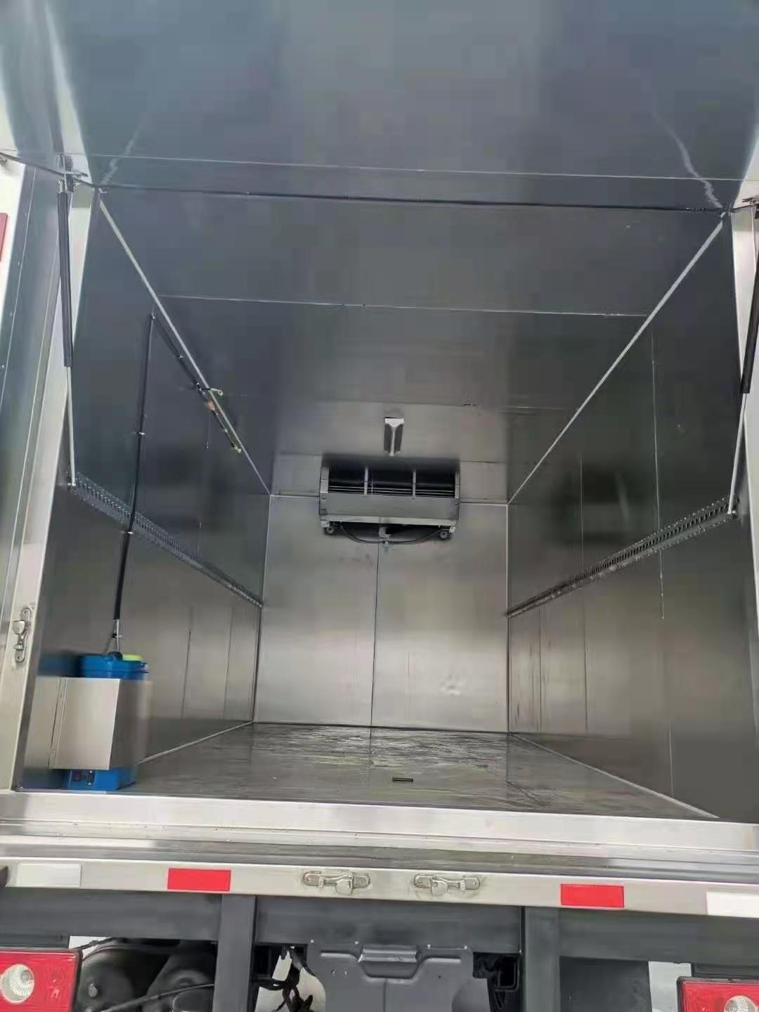 3.廂體內部安裝自動噴霧裝置,可進行自動噴霧消毒,殺菌。配備不銹鋼污水處理箱,4.采用國產-5度制冷機組(安裝在箱體前上部),后雙開門,外玻璃鋼,廂內6個面均不銹鋼板,中間8cm厚保溫層,加裝隔貨條,污水處理箱,后部帶密封門一個,鋁合金型材包邊,不銹鋼門框及鎖件。 箱體里面配自動噴霧消毒、紫外線殺菌消毒。