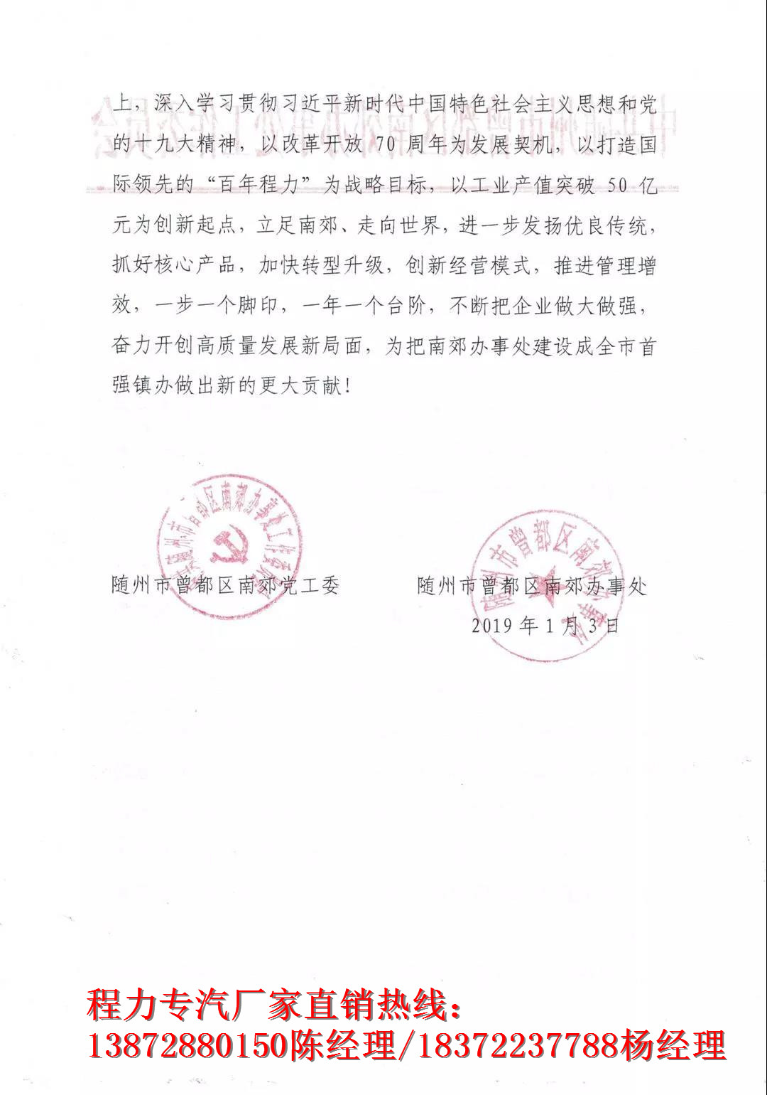 近日,程力專汽集團收到了一封特殊的賀信,來自曾都區(qū)南郊黨工委南郊辦事處。這不是一張簡單的賀信,這是一份擔(dān)當(dāng)和責(zé)任,更是一種智慧和實力的展現(xiàn)。程力人從2015不到20億元,到2017年突破36億元,程力用2年時間基本實現(xiàn)產(chǎn)值翻番,而過去的2018年,程力人在新經(jīng)濟、新常態(tài)下,實現(xiàn)逆勢穩(wěn)步增長華麗轉(zhuǎn)身,提前2年完成了“十三五”制定的目標(biāo),確實可圈可點,值得思索點贊;同時,這也是一份期待已久驚喜和祝福,更是一份鞭策與鼓勵。