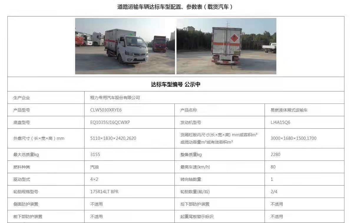 自2019年5月1日實行安全達標后,目前每一款新車型上市后,都要通過安全達標才能投放市場銷售,為了讓客戶選擇更多樣化,我司不斷更新新款車型。今天為您推薦東風國六易燃液體廂式車,具體明細如下: