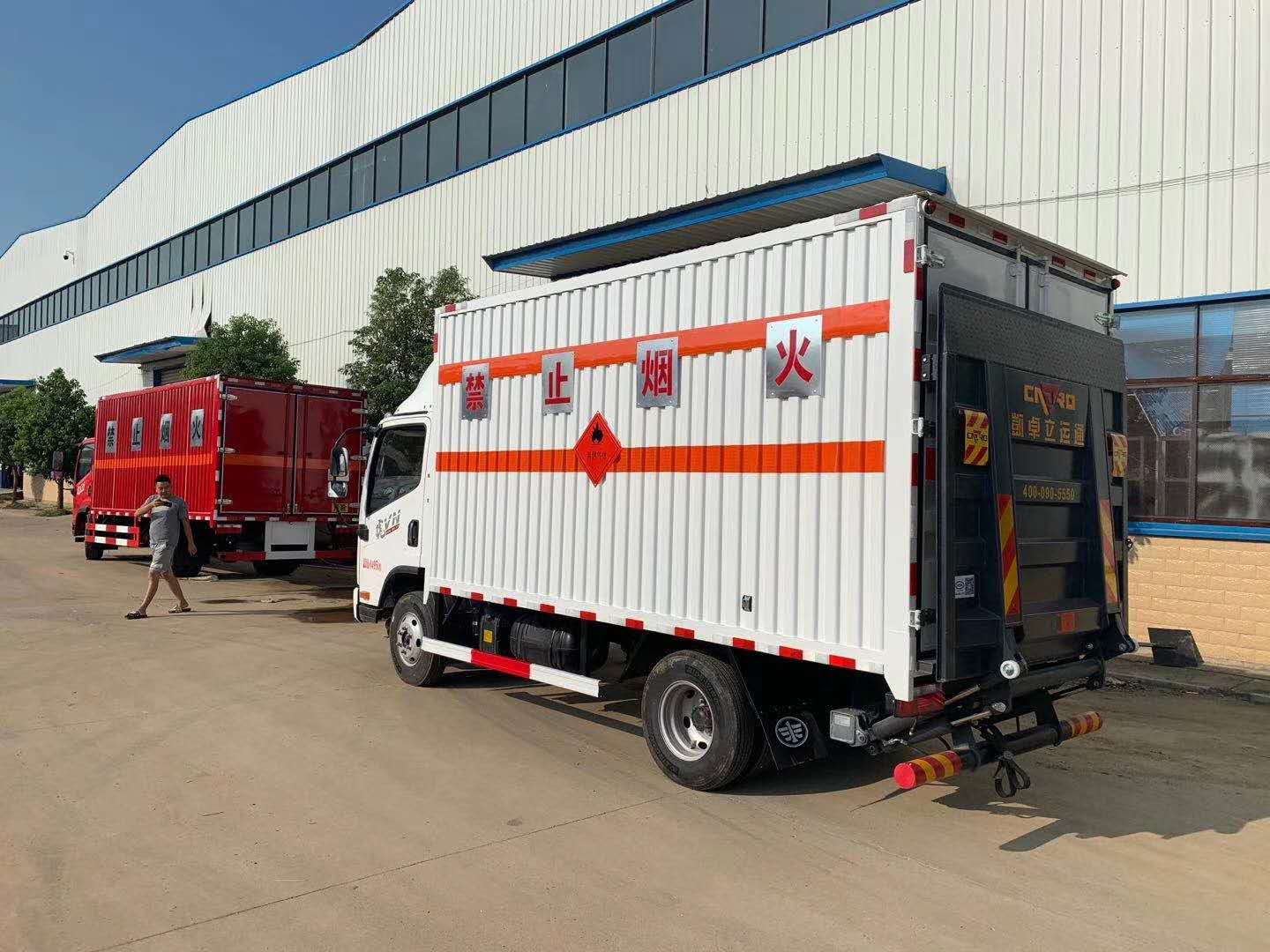 貨廂尺寸:4050mm×2000mm×1800mm,貨廂為復合型防靜電防阻燃材質而成,外飾冷軋鋼板內飾鋁合金板中間夾防阻燃材質擠塑板,廂體側板上部安裝防雨水通風孔,中部配有捆綁固定貨物的臥環,底板鋪防靜電膠板,廂體頂部安裝煙霧報警器,側門及尾門有防盜報警功能。駕駛室配備三角警示燈,整車反光標,廂體粘貼危險品標識,尾部粘貼危險品告示,隨車配備滅火器、反光背心、停車木。