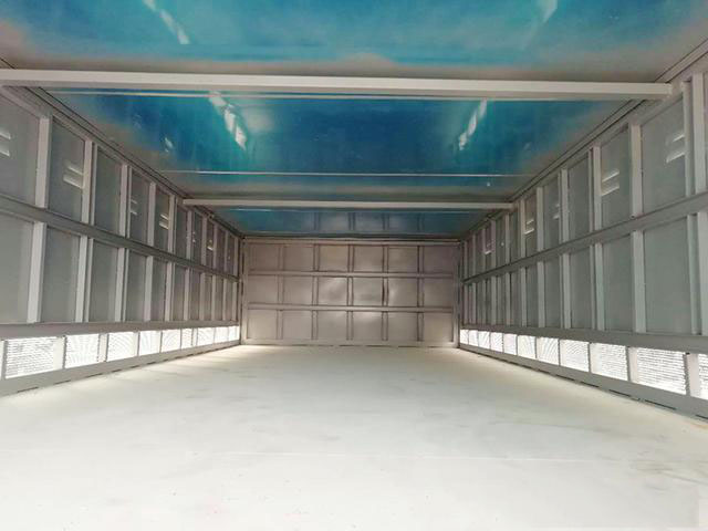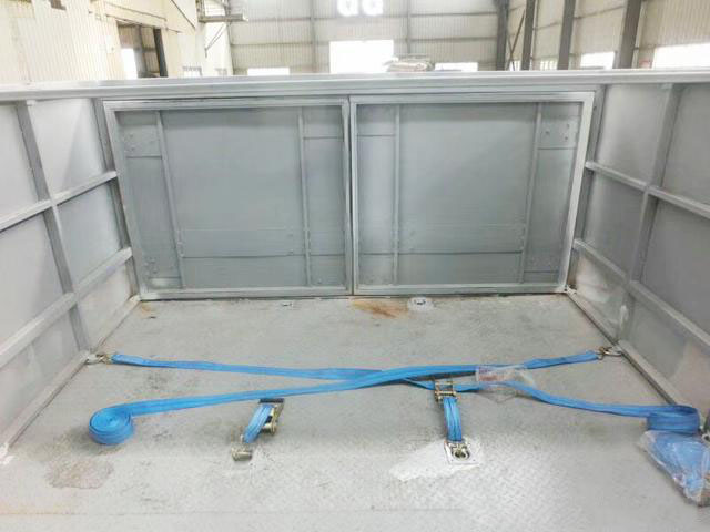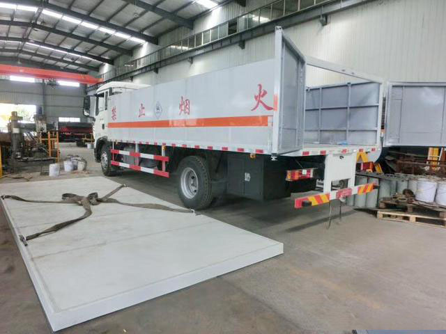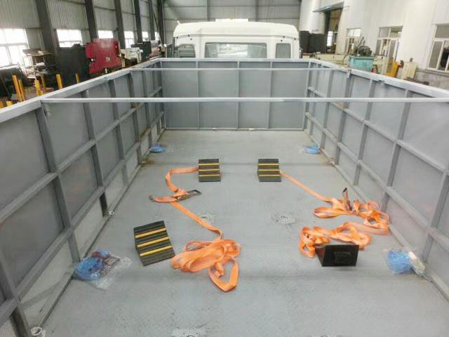 2)上裝配置:廂長(zhǎng)6.6米,廂體采用外冷軋板內(nèi)框架,采用槽鋼連接方管焊牢加固,廂體側(cè)板上面帶一次性沖壓成型百葉窗,側(cè)板下面帶網(wǎng)眼透氣孔,底板5mm厚鋼板,底部上鋪防靜電膠皮,后門安裝防盜報(bào)警器,帶危險(xiǎn)品三角燈防火罩。