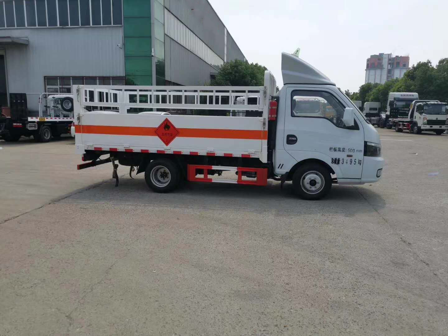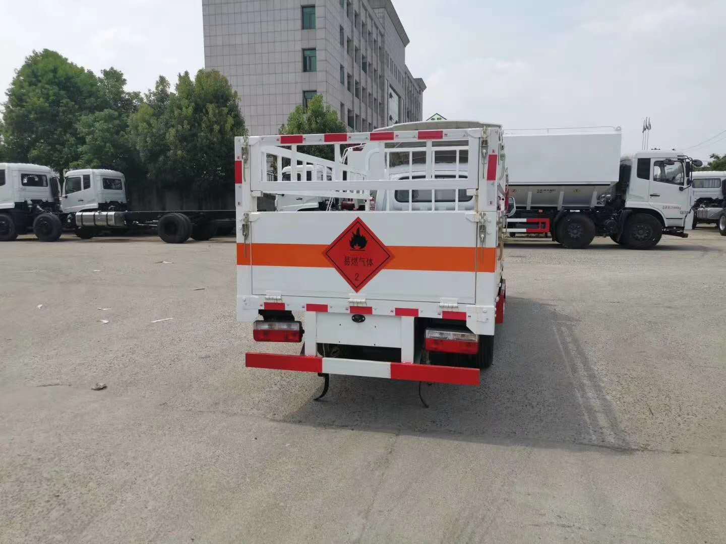 東風途逸國六藍牌氣瓶運輸車嚴格按照公告尺寸制作,邊2底3材質,帶可卸式高欄,底板上鋪靜電膠皮,配備滅火器,三角頂燈,靜電拖帶等,嚴格按照國家危險品法規進行“易燃氣體”標識粘貼等。