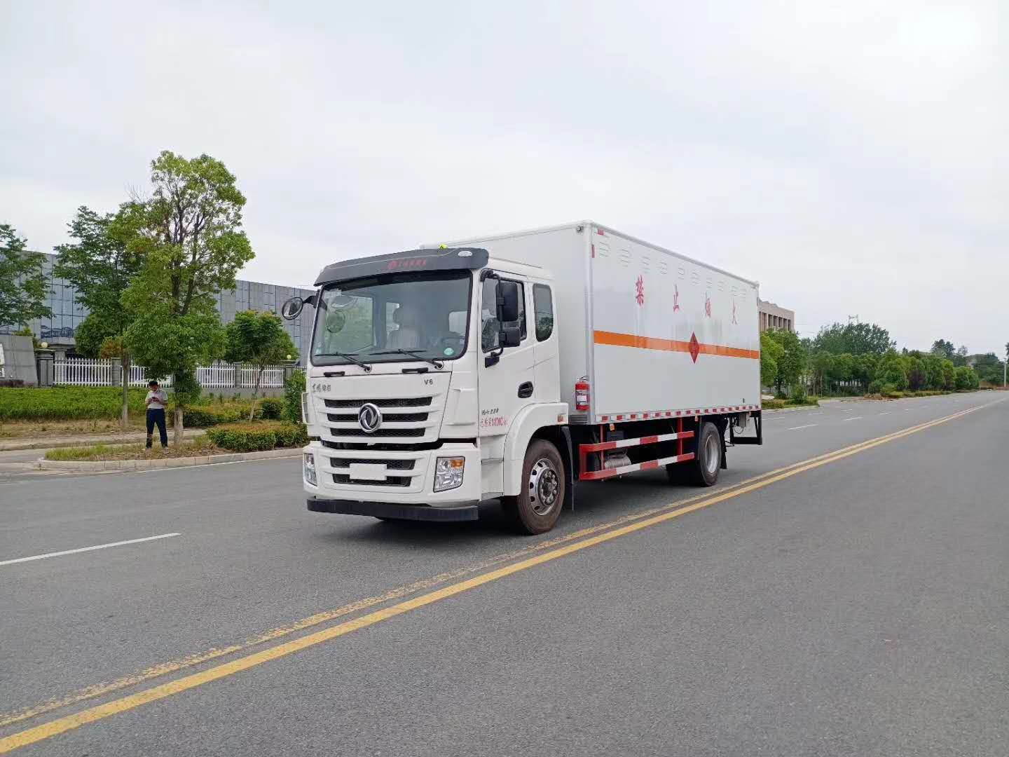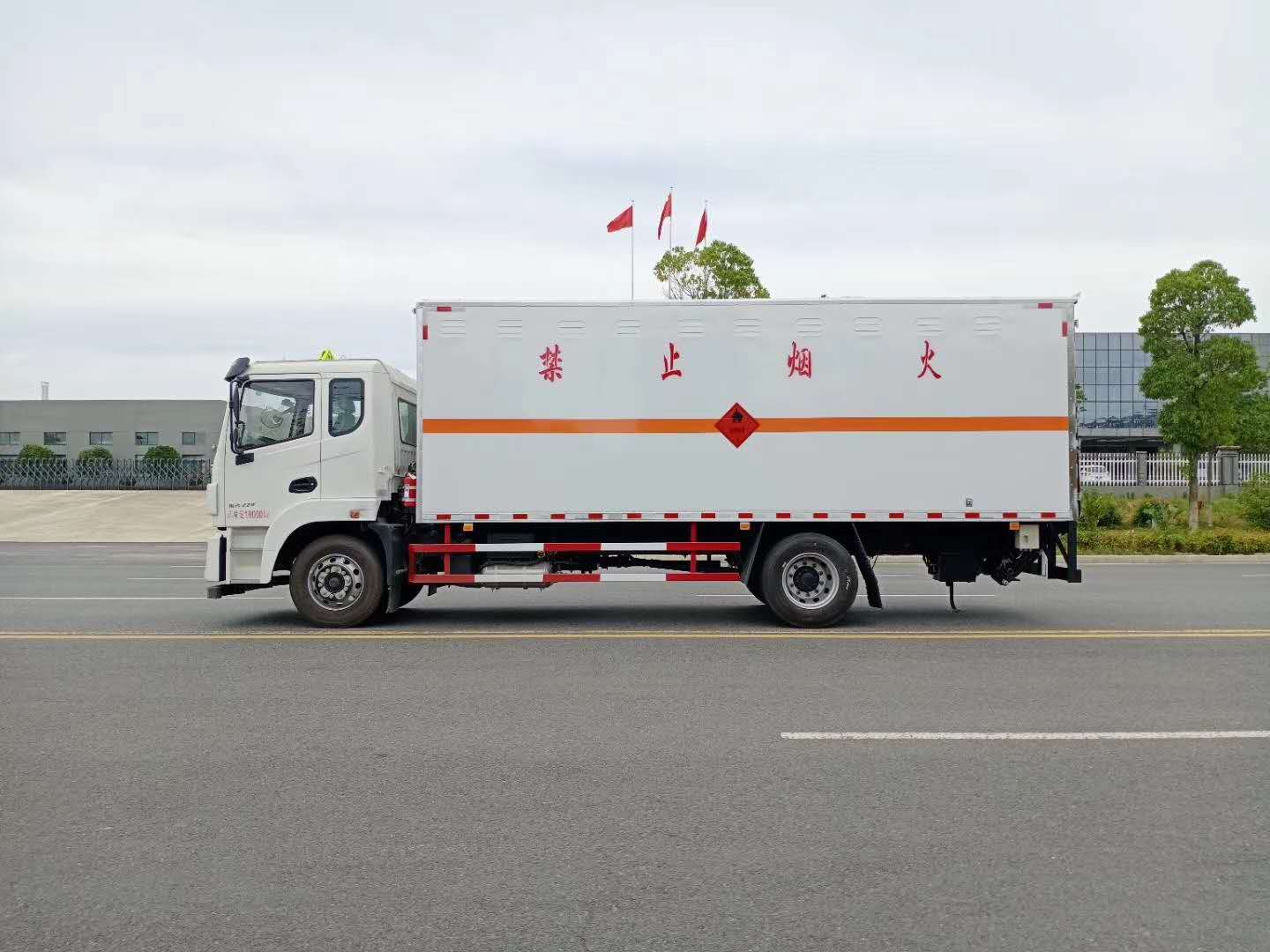 廂體配置:廂體材質(zhì)為外飾冷軋鋼板、內(nèi)飾鋁合金板、中間填充隔熱阻燃材料,選裝側(cè)門和隔倉,廂體兩側(cè)上方設(shè)有防雨功能自然通風(fēng)窗口,底部鋪有阻燃導(dǎo)靜電膠板,廂體側(cè)面裝有固定拉環(huán),與捆綁帶使用捆綁貨物以避免移動。在車廂內(nèi)頂部安裝感煙報(bào)警器,在門器框上方安裝有防盜報(bào)警器,廂體外側(cè)安裝示廓燈及滅火器支架,配置兩個滅火器,并有“嚴(yán)禁煙火”和“易燃液體”等字樣,廂體周邊貼反光標(biāo)識。后門貼有安全告示,危險(xiǎn)品標(biāo)牌。車輛尾部副梁安裝兩條拖地導(dǎo)靜電帶,駕駛室頂部裝有安全三角燈。廂體顏色可定制:黃、白、灰色等。