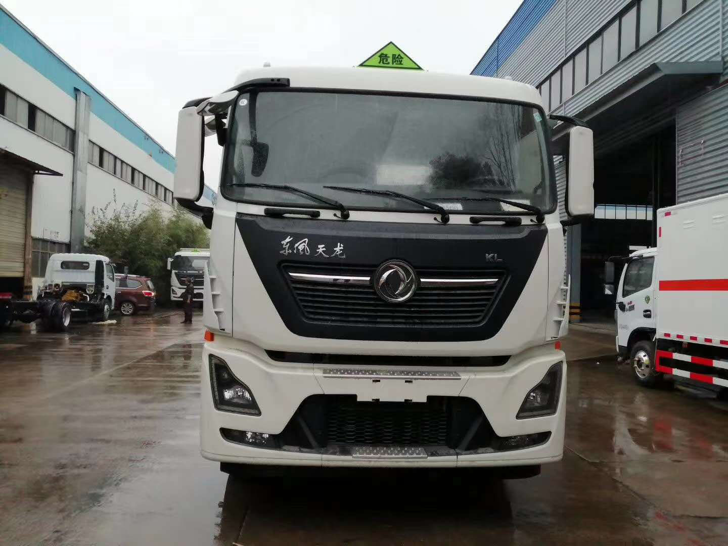 東風天龍前四后八國六氣瓶運輸車采用欄板車結構,外厚度為1.1毫米厚度武鋼冷軋鋼板(或沖壓成瓦楞板,以公告為準),內加強“幾”字型加強梁,車體底板加強處理并做防靜電處理。車體的左側、右側,和后欄板栓鉤結構,可向下打開,方便上下貨物,車體為密封廂式車型,大大減少了運輸物品因為狹窄空和強烈碰撞產生氣瓶爆炸的危險性,箱體外觀涂裝白色油漆,在欄板的中間位置粘貼橙色的危化車標帶,并在車體的左、右、后部粘貼“爆”字標識。駕駛室內部配備兩只滅火器,后保險杠處安裝防追尾事故的緩沖固定塊。此款車輛屬于國家規定的危險品二類危險品運輸車。