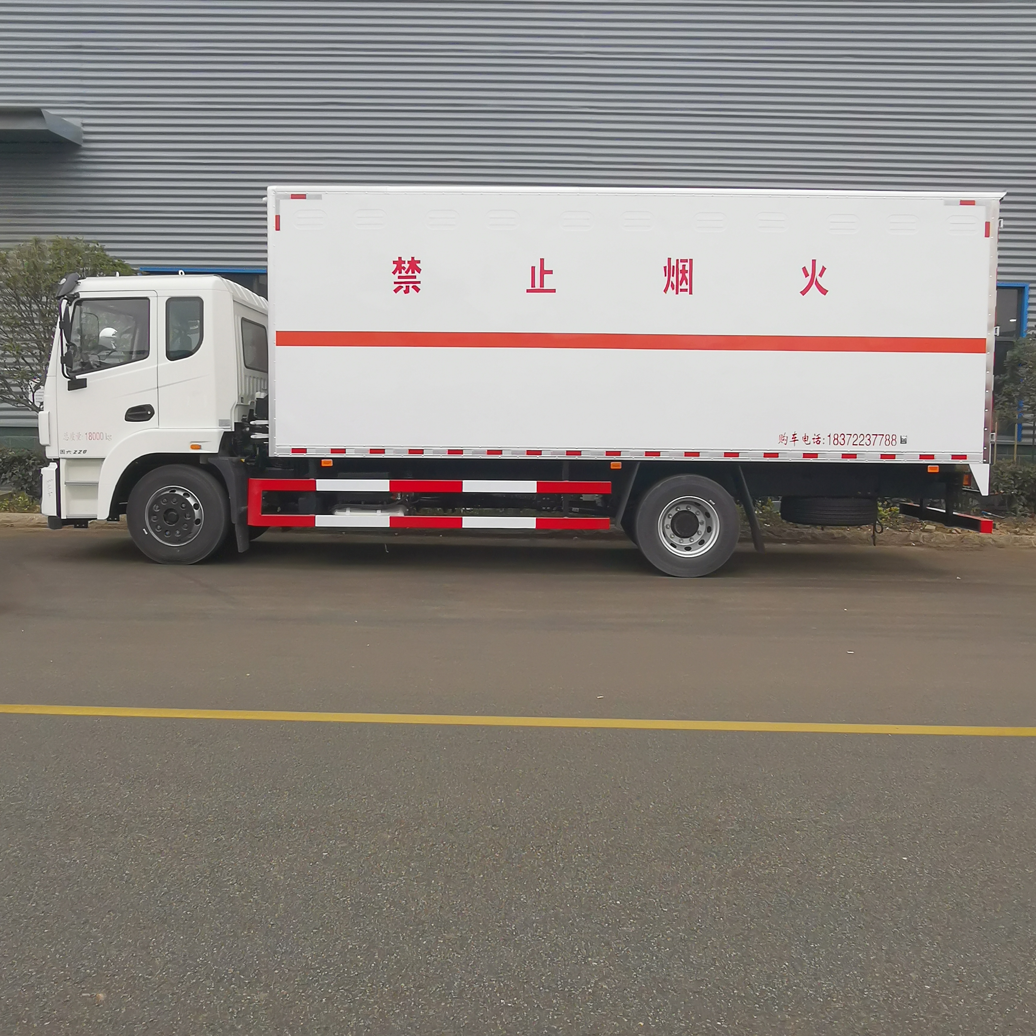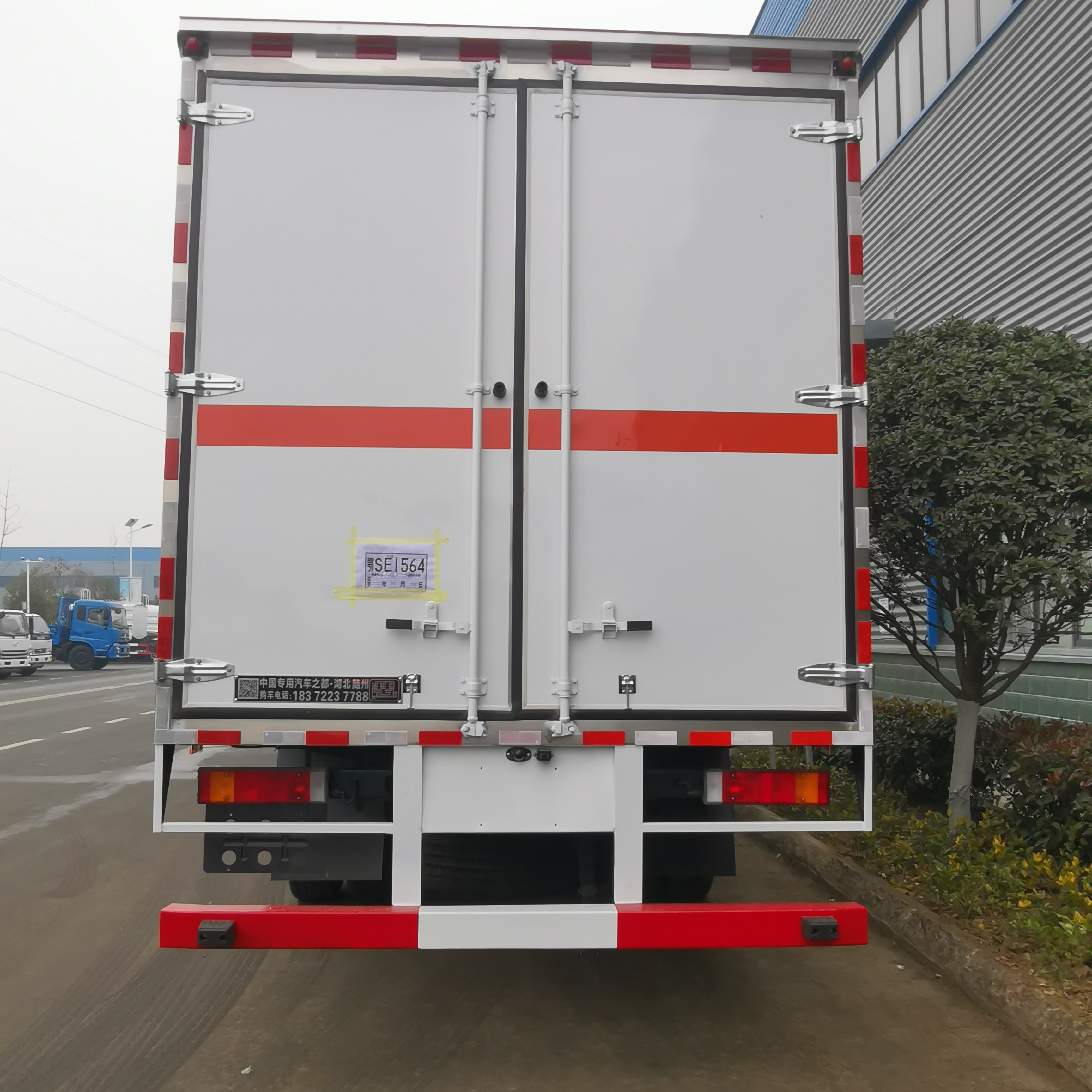 東風錦程國六6米8危險品車廂體內尺寸(長×寬×高)(mm):6800×2400×2400,廂體嚴格按照公告尺寸及外觀制作,廂體外板采用1.2mm厚冷軋板,上部留有一次性沖壓成型的百葉窗,內飾導電性能良好的鋁板并帶有有透氣孔,內襯矩形管骨架牢靠穩定,內部填充透氣防潮阻燃的泡沫板,四種材料經現代工藝復合加工而成;廂體外部上下鋁合金型材包邊,底板和車廂前下部鋪設防靜電橡膠皮,內部安裝有固定貨物的臥環,四周安裝防撞護板,廂體一側可選裝側開門;車廂內安裝有車載專用煙霧報警器,后門、側門防盜報警器;安裝靜電拖地帶,滅火器,防火罩;貼橙色反光帶,紅白反光板,粘貼菱形2類危險品標示,安全告示牌。