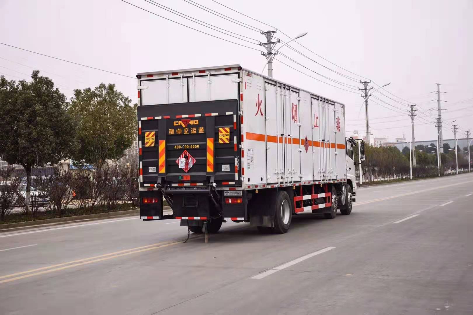 東風(fēng)天錦7米7國六危險品車廂體采用外飾冷軋鋼板,內(nèi)飾鋁合金板,中間填充隔熱阻燃材料,(選裝側(cè)門和隔倉)廂體兩側(cè)上方設(shè)有防雨功能自然通風(fēng)窗口,底部鋪有阻燃導(dǎo)靜電膠板,廂體側(cè)面裝有固定拉環(huán),與捆綁帶使用捆綁貨物以避免移動。在車廂內(nèi)頂部安裝感煙報警器,在門器框上方安裝有防盜報警器,廂體外側(cè)安裝示廓燈及滅火器支架,配置兩個滅火器,并有“嚴(yán)禁煙火”和“爆”等字樣,廂體周邊貼反光標(biāo)識。后門貼有安全告示,危險品標(biāo)牌。車輛尾部安裝兩條拖地導(dǎo)靜電膠帶,駕駛室頂部裝有安全三角燈。廂體顏色有:黃、白、灰色等可選。