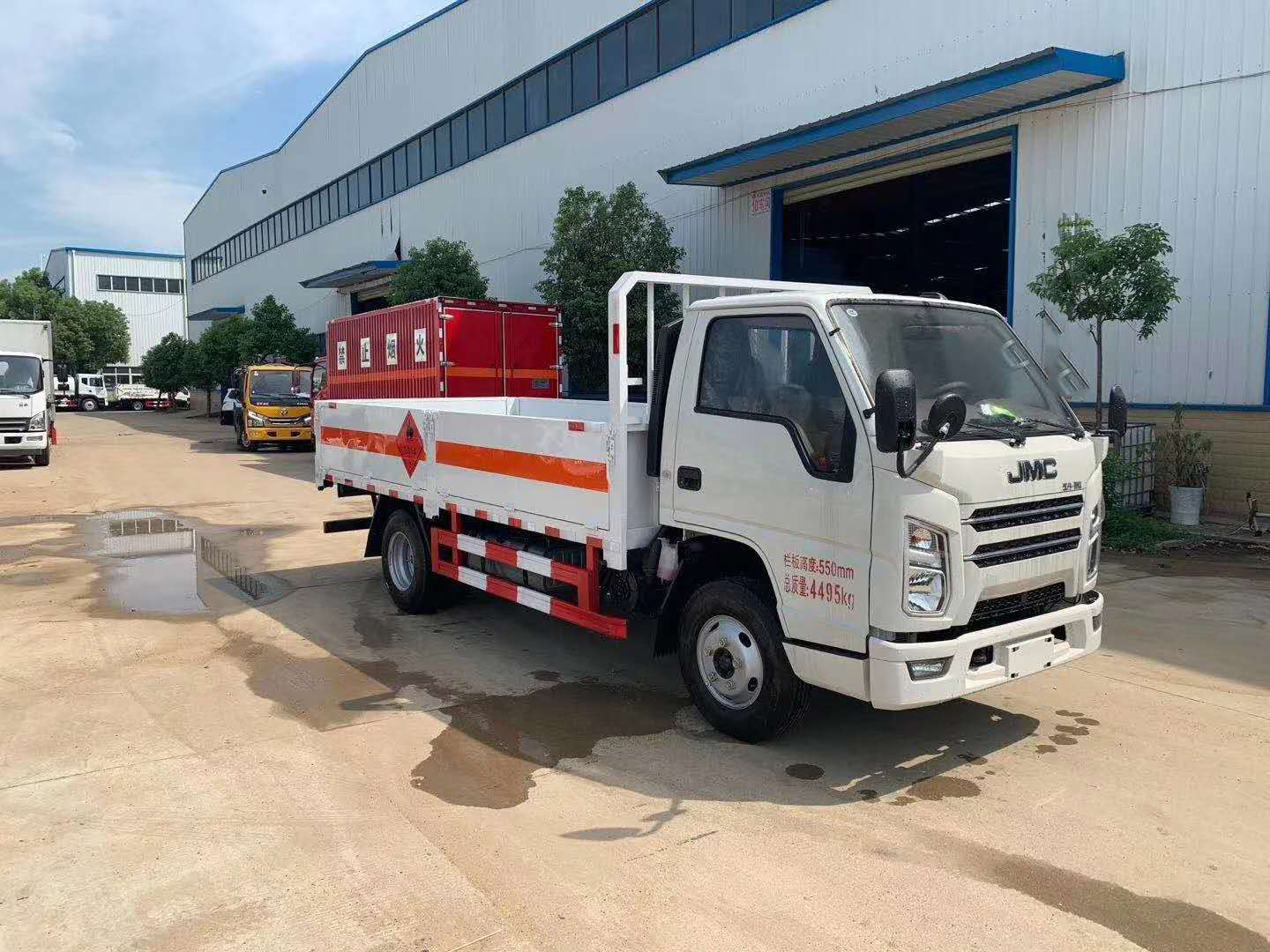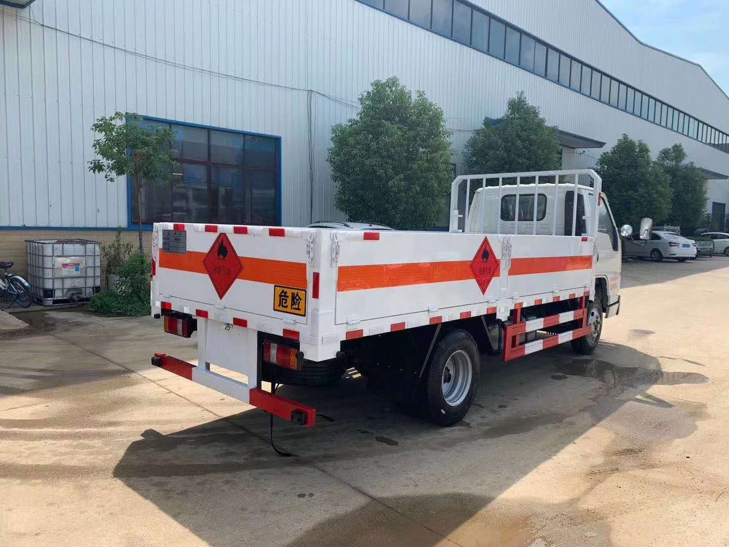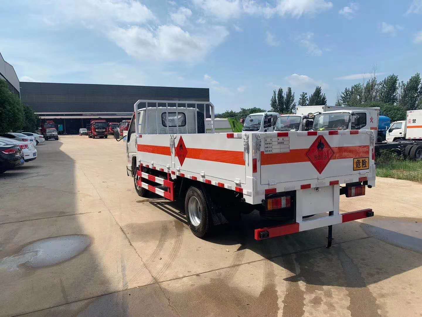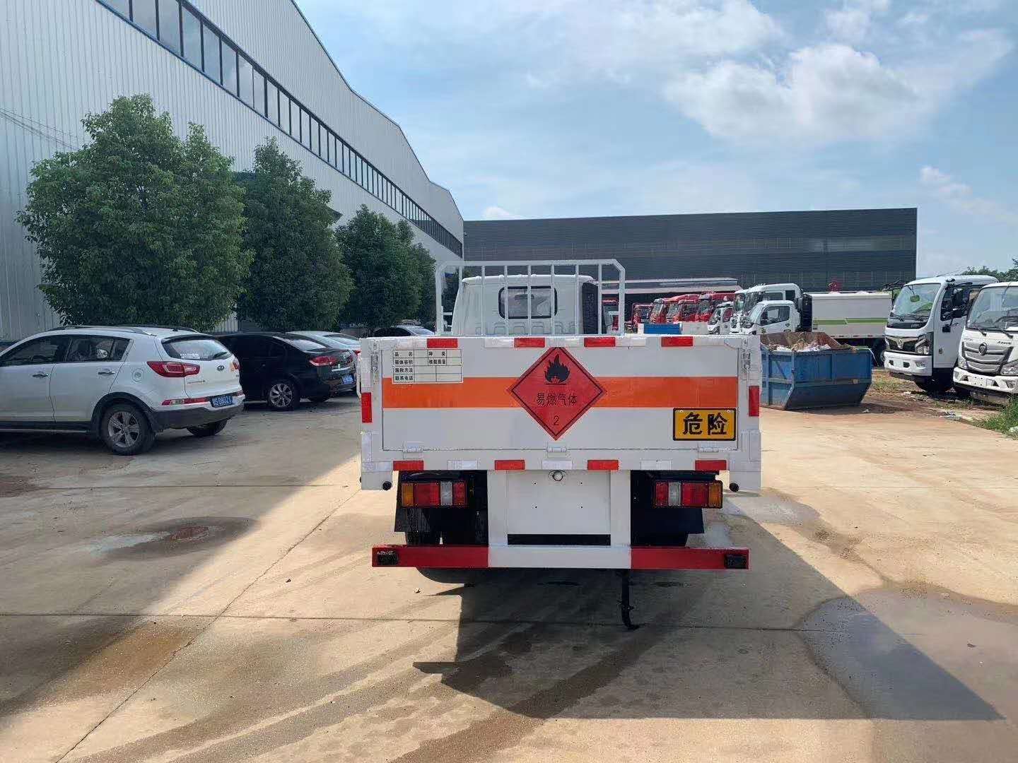 江鈴國六氣瓶運輸車嚴格按照公告尺寸制作,底板采用3個厚花紋板制作,底板上鋪靜電膠皮,帶可卸式高欄,配備滅火器,三角頂燈,靜電拖帶等,嚴格按照國家危險品法規(guī)進行“易燃氣體”標識粘貼等。