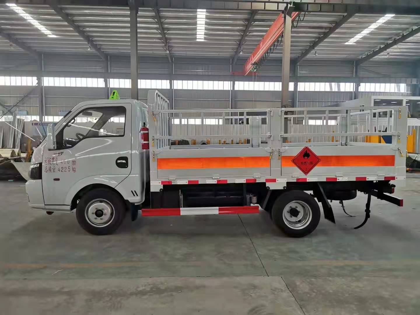 國六東風途逸柴油氣瓶車箱體采用廂式欄板車結構,外厚度為1.1毫米厚度武鋼冷軋鋼板(或沖壓成瓦楞板,以公告為準),內加強“幾”字型加強梁,車體底板加強處理并做防靜電處理。車體的左側、右側,和后欄板栓鉤結構,可向下打開,方便上下貨物,車體為空曠式車型,大大減少了運輸物品因為狹窄空和強烈碰撞產生氣瓶爆炸的危險性,箱體外觀涂裝白色油漆,在欄板的中間位置粘貼橙色的危化車標帶,并在車體的左、右、后部粘貼“易燃氣體”或“不燃氣體”標識。駕駛室內部配備兩只滅火器,后保險杠處安裝防追尾事故的緩沖固定塊。此款車輛屬于國家規定的危險品二類倉欄式運輸車。廂體內部有固定貨物的臥環,車輛外部有靜電帶、滅火器、防火罩,車廂內安裝煙霧報警器和門防盜報警器,嚴格按照國家危險品相關法規張貼。