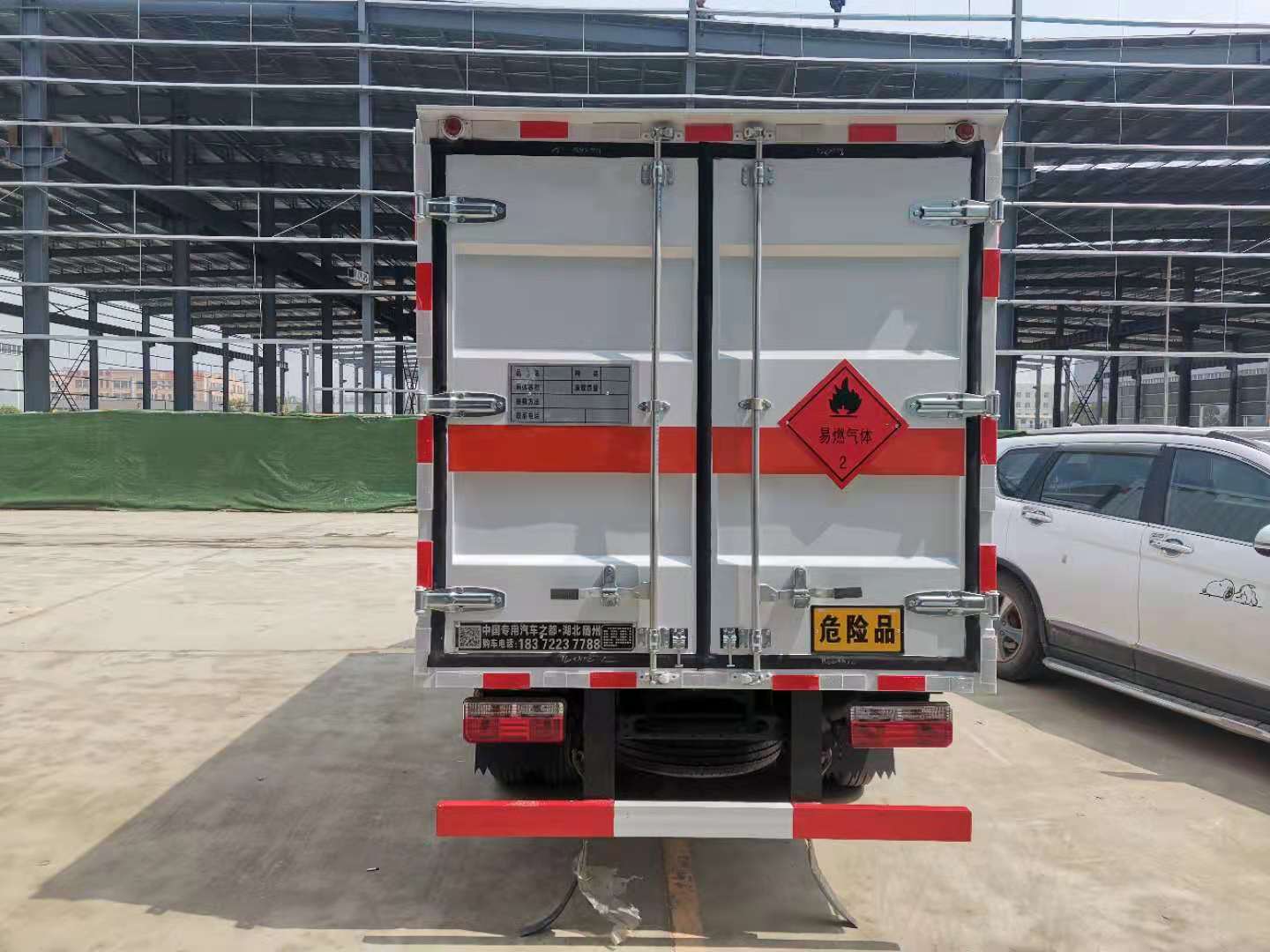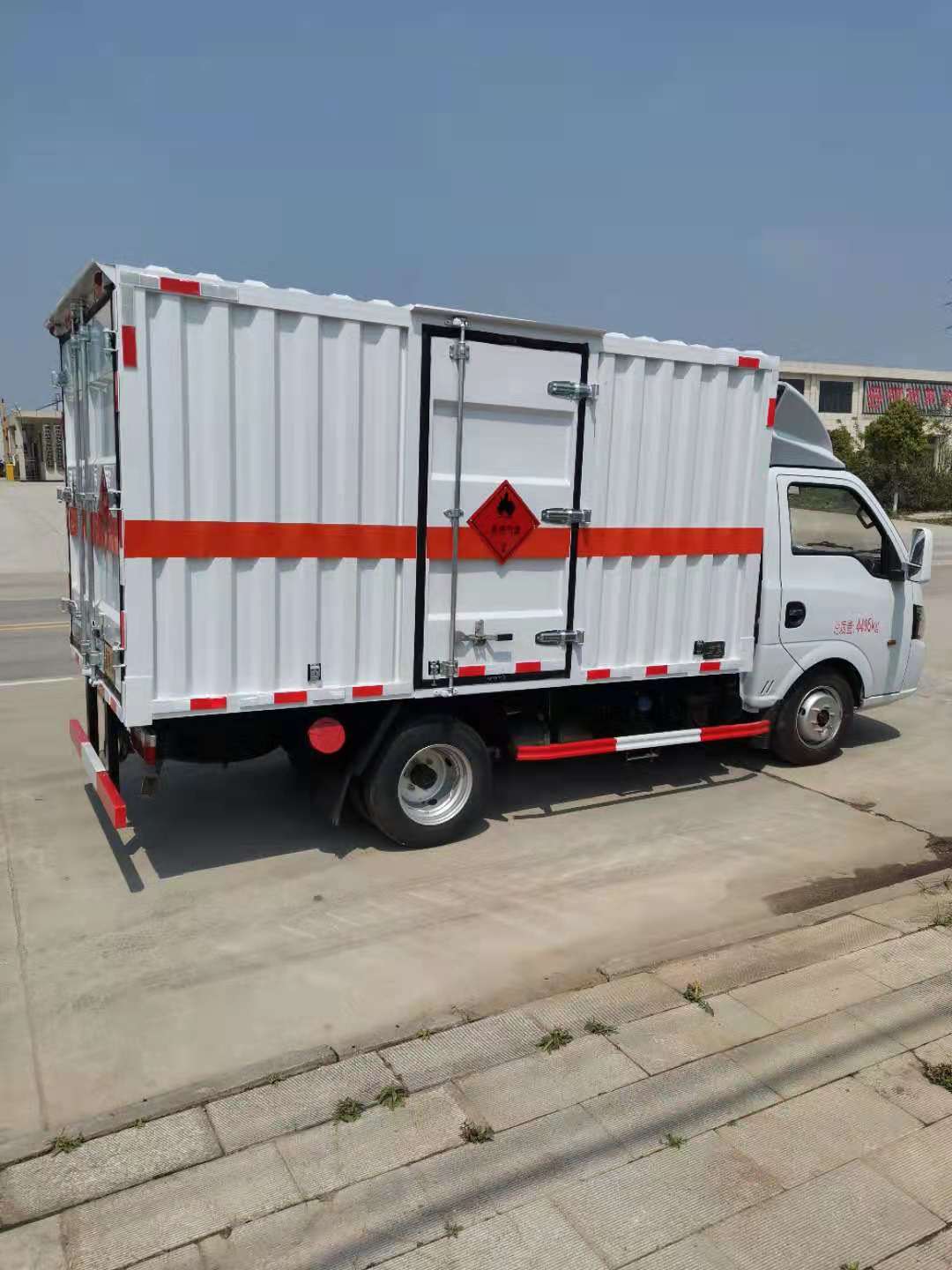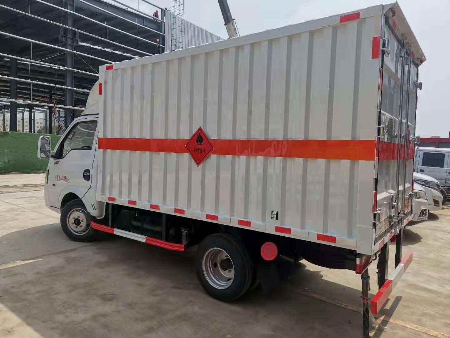 東風途逸國六瓦楞板危險品車廂體材質為瓦楞廂體,底部鋪有阻燃導靜電膠板,廂體側面裝有固定拉環。在車廂內頂部安裝感煙報警器,在門器框上方安裝有防盜報警器,廂體外側安裝示廓燈及滅火器支架,配置兩個滅火器,并有“嚴禁煙火”和“易燃氣體”等字樣,廂體周邊貼反光標識。后門貼有安全告示,危險品標牌。車輛尾部副梁安裝兩條拖地導靜電帶,駕駛室頂部裝有安全三角燈。廂體顏色可定制:黃、白、灰色等。