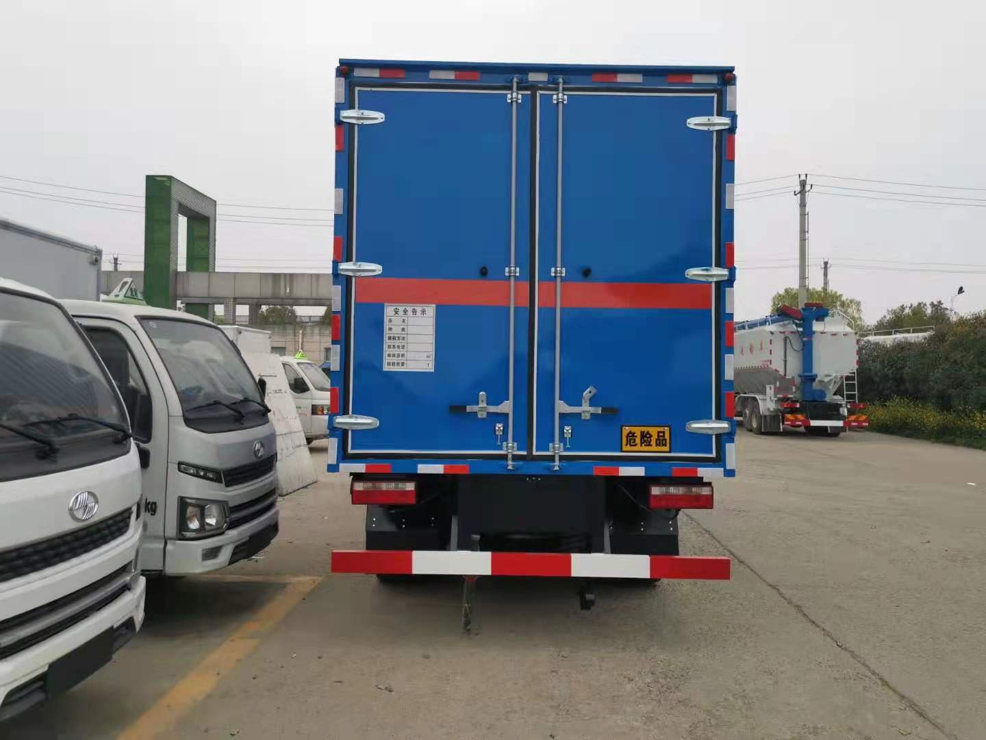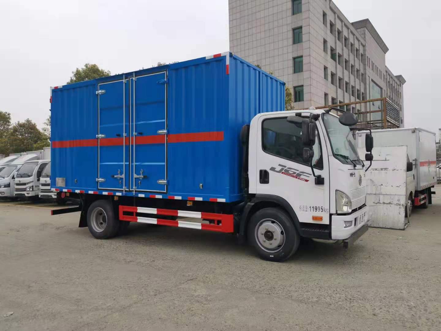 解放J6F國六5米1藍色危險品車廂體為瓦楞廂體,嚴格按照公告尺寸制作,外板采用1mm厚冷軋板有一次性成型的百葉窗,廂體外部上下鋁合金型材包邊,底板和車廂前下部鋪橡膠皮,后門雙開,右側(cè)中部兩個雙開門,內(nèi)部有固定貨物的臥環(huán),車輛外部有靜電帶、滅火器、防火罩,車廂內(nèi)安裝煙霧報警器和門防盜報警器,嚴格按照國家危險品相關(guān)法規(guī)張貼。