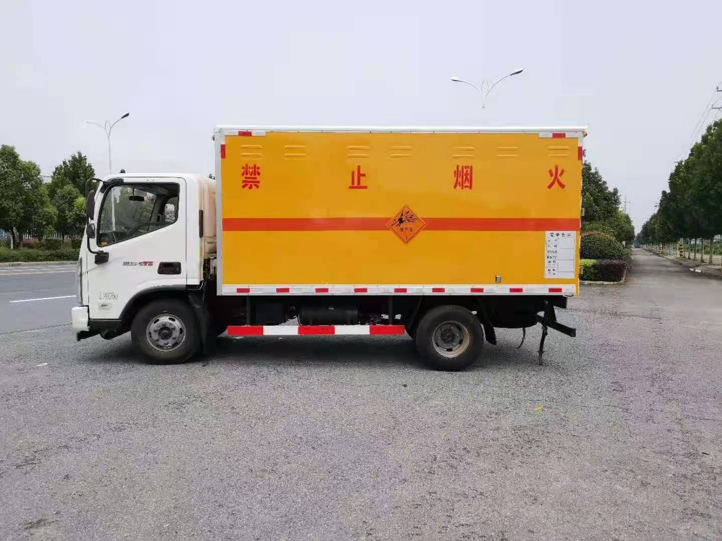 新規福田藍牌爆破運輸車采用福田危險品車專用底盤,國六排放,3360mm軸距,全柴130馬力發動機,帶原裝空調,5檔變速箱,后雙輪,中控門鎖,電動門窗。體為雙層金屬結構,外板采用靜電屏蔽冷軋鋼板,中間填充B1級阻燃泡沫,內飾為鋁板。廂體上側安裝防雨通風透氣孔。底板為花紋板(或平板),上鋪防靜電膠皮,廂體右側中開單側門。廂內兩側加裝固定貨物臥環,門框帶防盜報警器,頂部帶煙霧報警器。配備隨車工具,2個滅火器,三角頂燈,2條防靜電拖帶,貼反光標識等。其他按公告標準制作。