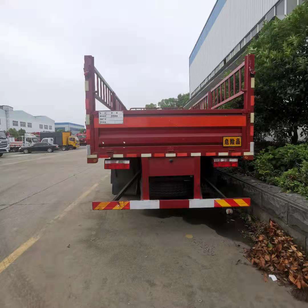 7米8東風D9國六液化氣瓶車采用東風D9原廠危險品車底盤,康明斯220馬力發動機,帶ABS、原廠空調、排氣管前置、帶方向助力、限速裝置,帶安全帶未系提醒、剎車襯片預警提示、防爆胎裝置。采用廂式欄板車結構,外厚度為1.1毫米厚度武鋼冷軋鋼板(或沖壓成瓦楞板,以公告為準),內加強“幾”字型加強梁,車體底板加強處理并做防靜電處理。車體的左側、右側,和后欄板栓鉤結構,可向下打開,方便上下貨物,車體為空曠式車型,大大減少了運輸物品因為狹窄空和強烈碰撞產生氣瓶爆炸的危險性,箱體外觀涂裝白色油漆,在欄板的中間位置粘貼橙色的;嚇藥,并在車體的左、右、后部粘貼“易燃氣體”或“不燃氣體”標識。駕駛室內部配備兩只滅火器,后杠處安裝防追尾事故的緩沖固定塊。此款車輛屬于國家規定的危險品二類危險品運輸車。