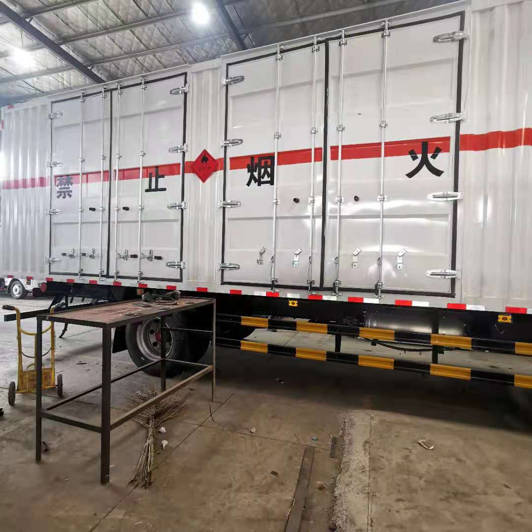 7米6東風D9雜項危貨車廂體外板采用1.2mm厚冷軋鋼板壓瓦成型,內部槽鋼骨架,底板采用3mm花紋板上鋪設防靜電膠皮。廂體右側開對開門,后部設置對開門,廂體內部兩側安裝捆綁貨物的臥環。廂體內部安裝煙霧報警器及防盜報警感應器。