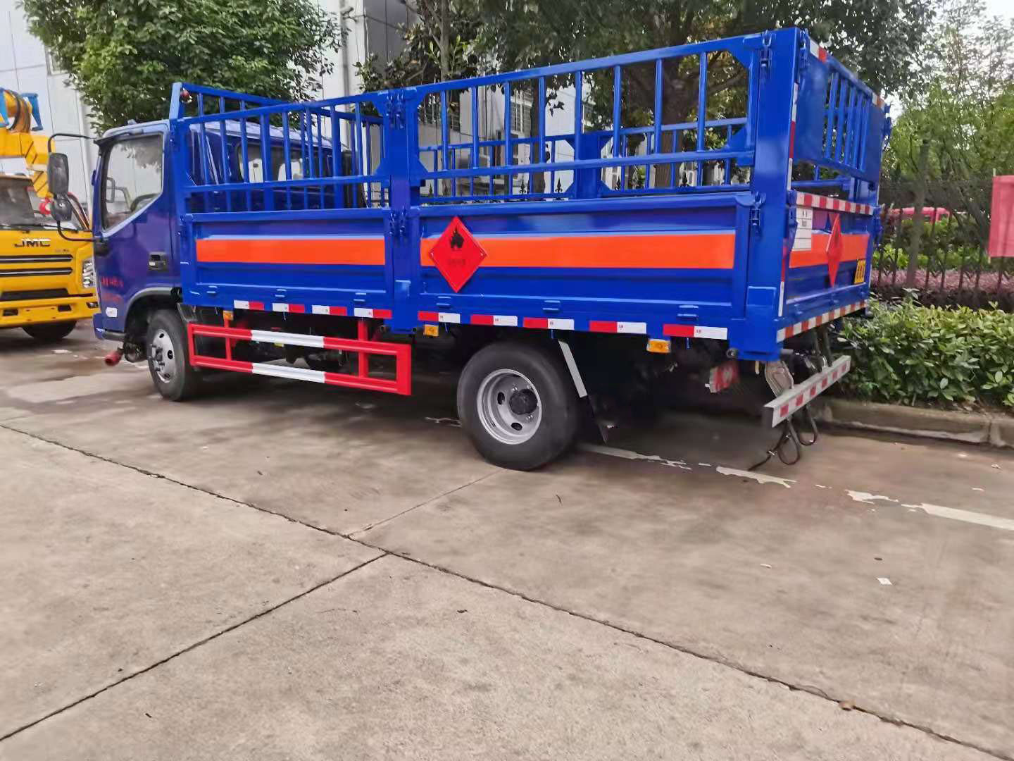 福田奧鈴氣瓶運輸車可選高欄或者低欄板,客戶可根據自身需求進行定制,該車的顏色可選,廂體外粘貼危險品標識。