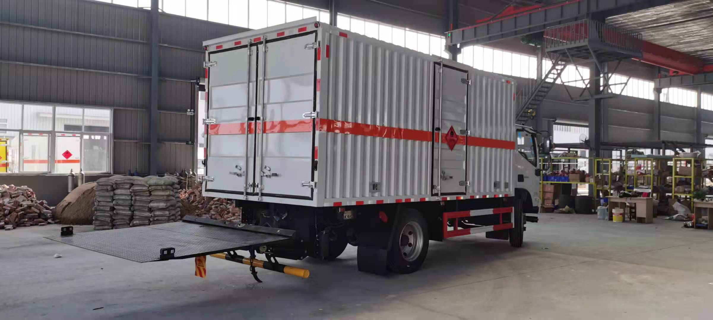 福田歐馬可3.8排量156馬力國六5米1危險品車沖壓成瓦楞板,以公告為準),內加強“幾”字型加強梁,車體底板加強處理并做防靜電處理。車體的左側、右側,和后欄板栓鉤結構,可向下打開,方便上下貨物,車體為空曠式車型,大大減少了運輸物品因為狹窄空和強烈碰撞產生氣瓶爆炸的危險性,箱體外觀涂裝白色油漆,在欄板的中間位置粘貼橙色的危化車標帶,并在車體的左、右、后部粘貼“易燃氣體”或“不燃氣體”標識。駕駛室內部配備兩只滅火器,后杠處安裝防追尾事故的緩沖固定塊。此款車輛屬于國家規定的危險品二類危險品運輸車。
