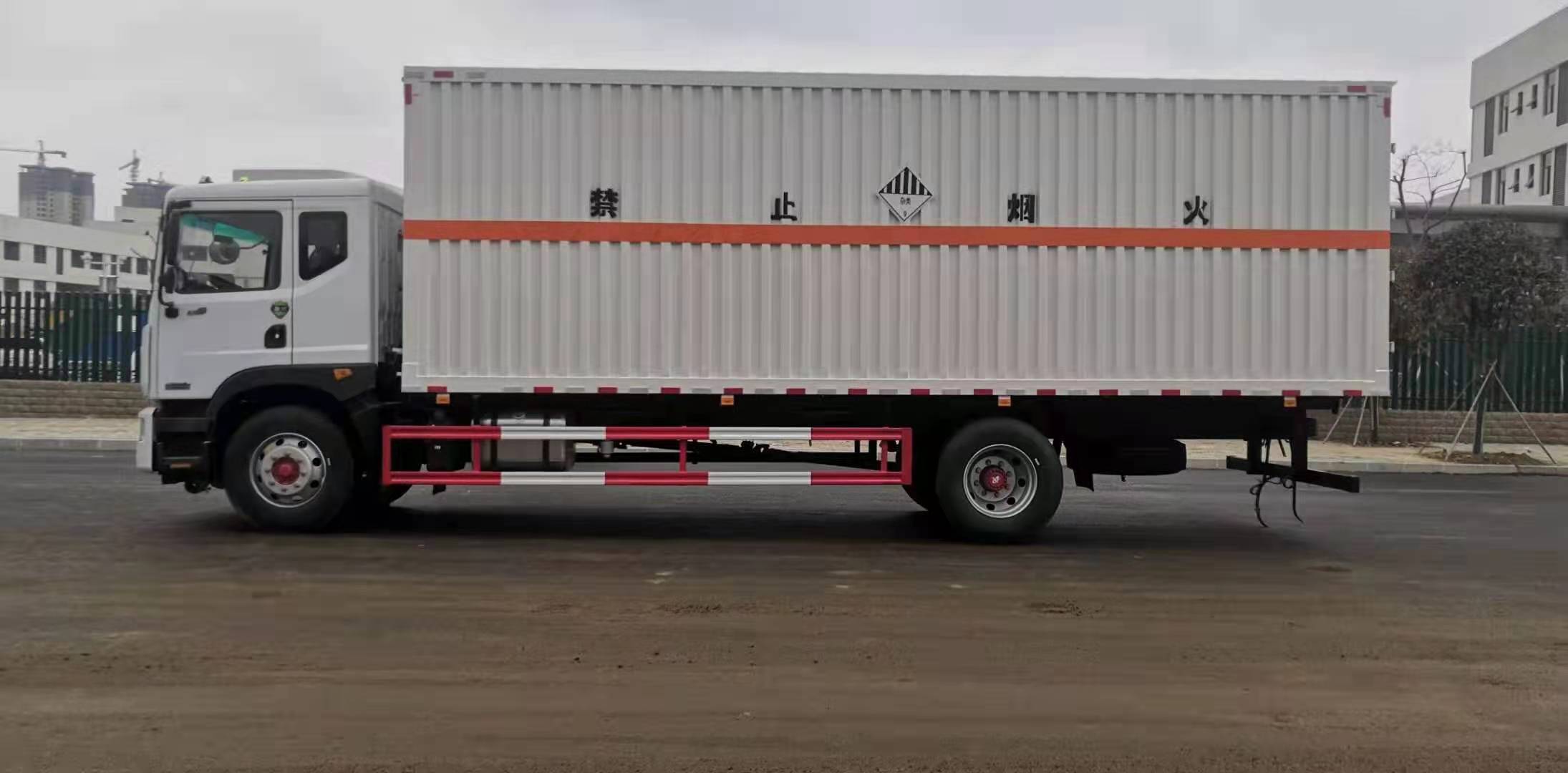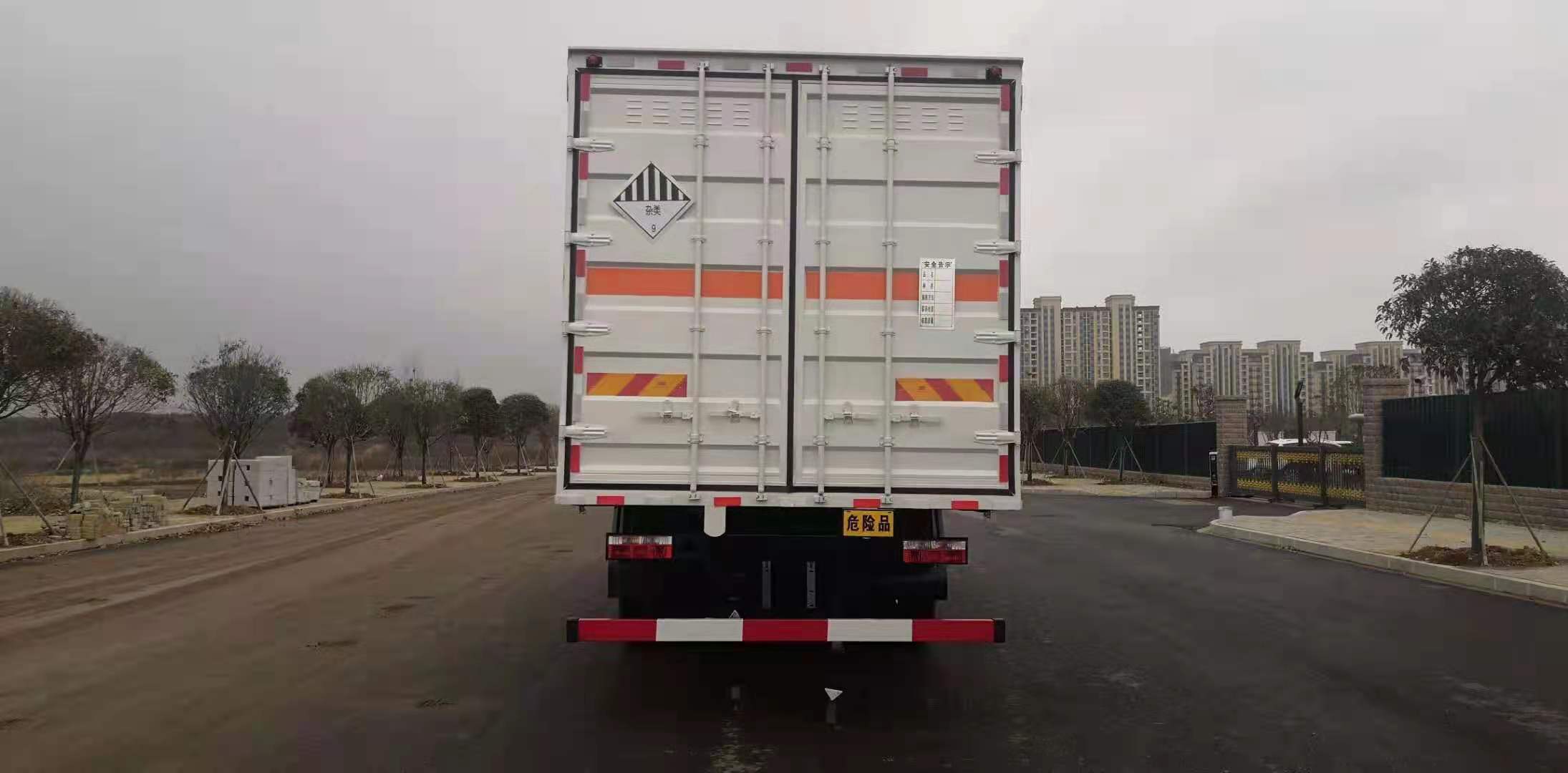 東風D9瓦楞板雜項國六危險品車外板采用1.2mm厚冷軋鋼板壓瓦成型,內部槽鋼骨架,底板采用3mm花紋板上鋪設防靜電膠皮。廂體右側開對開門,后部設置對開門,廂體內部兩側安裝捆綁貨物的臥環。廂體內部安裝煙霧報警器及防盜報警感應器。