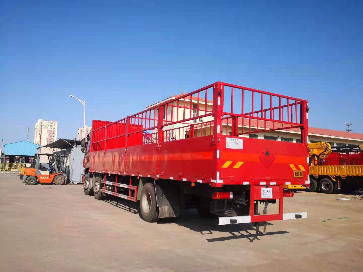 二手柳汽三軸9米6氣瓶車采用廂式欄板車結構,外厚度為1.1毫米厚度武鋼冷軋鋼板(或沖壓成瓦楞板,以公告為準),內加強“幾”字型加強梁,車體底板加強處理并做防靜電處理。車體的左側、右側,和后欄板栓鉤結構,可向下打開,方便上下貨物,車體為空曠式車型,大大減少了運輸物品因為狹窄空和強烈碰撞產生氣瓶爆炸的危險性,箱體外觀涂裝白色油漆,在欄板的中間位置粘貼橙色的危化車標帶,并在車體的左、右、后部粘貼“易燃氣體”或“不燃氣體”標識。駕駛室內部配備兩只滅火器,后杠處安裝防追尾事故的緩沖固定塊。此款車輛屬于國家規定的危險品二類危險品運輸車。