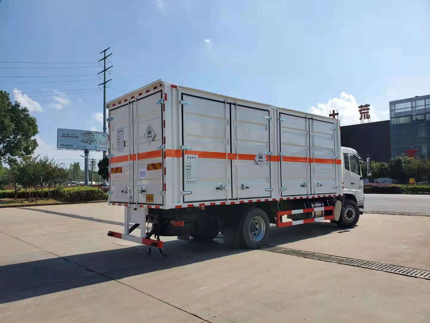 6.8米國六東風(fēng)天錦毒性氣體廂式運(yùn)輸車(2類3)廂體尺寸:6800*2450*2400(mm),廂體采用瓦楞板結(jié)構(gòu),瓦楞板厚度1.2mm,廂體底部鋪設(shè)防靜電膠皮。內(nèi)部有固定貨物的臥環(huán),副駕側(cè)帶兩個(gè)雙開側(cè)門,該車配有車載專用煙霧報(bào)警器及后門防盜器,有靜電帶、滅火器、防火罩。整車國標(biāo)反光標(biāo)示及警告標(biāo)志。