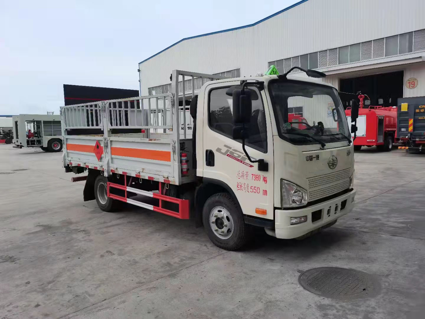 解放4米2黃牌國六氣瓶運輸車箱體標配3個厚的花紋板,副梁標配120的槽鋼,龍門架為100的槽鋼,墻板厚度為1.2個厚的冷軋板,廂體內部選裝固定貨物的卡槽,橫梁間距為320CM,底板配有靜電膠皮,選裝液壓尾板,底板加厚,橫梁加密,上部高欄中部打斷或底板立柱打斷,選裝瓦倫板結構墻板,平面板結構墻板,(可拆卸),選裝上部花欄上下翻轉或左右開啟.整車按照公告要求張貼反光標識,危險品標牌,安全告示等,靜電尾帶兩根,防火帽,隨車滅火器(一對),按照公告要求張貼“易燃氣體”“不燃氣體”標識。