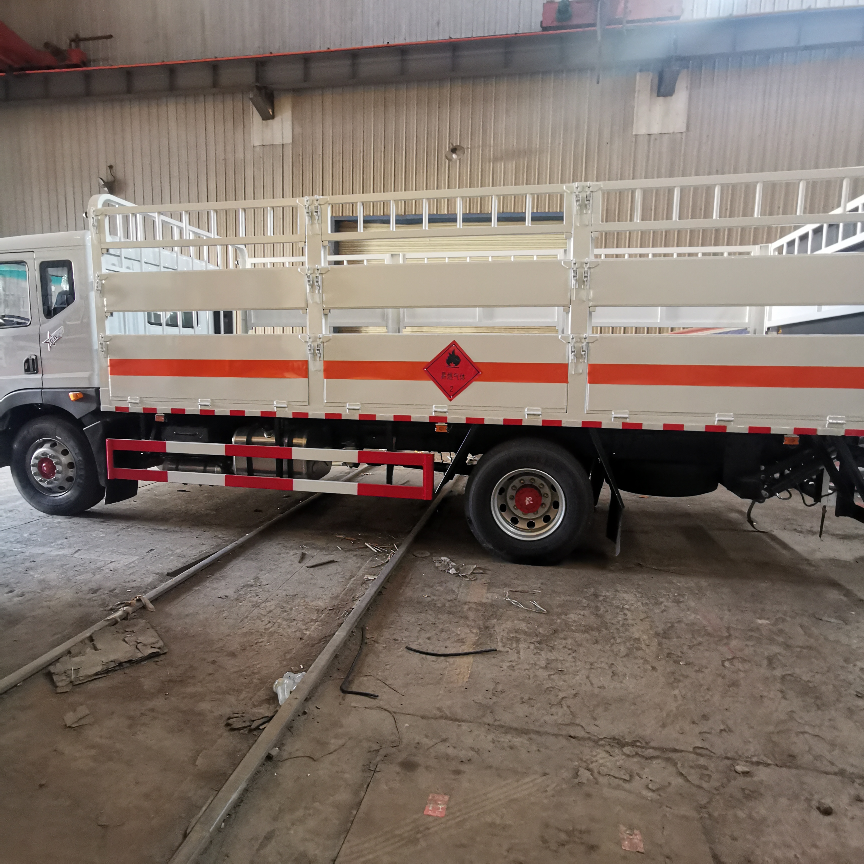 上裝配置: 氣瓶運輸車制作,嚴格按照公告尺寸,高欄式結構,貨箱尺寸:6300X2450X600mm,帶靜電帶,二個滅火器,防火罩,整車國標反光標示及警告標志,側面及后下部防護裝置材料為Q235,三個菱形標識牌,一圈橙色反光帶,一個安全告知標牌。帶接地導靜電膠帶,三角頂燈,其余標配。油漆:駕駛室白色,廂體白色,貼反光帶,反光板,貼危險品級別菱形標志,安全告示牌。 提供整車合格證,底盤合格證,一致性證書,環保清單,一車一票。