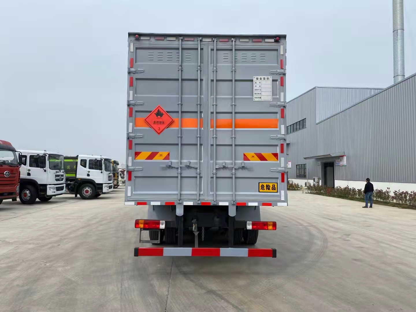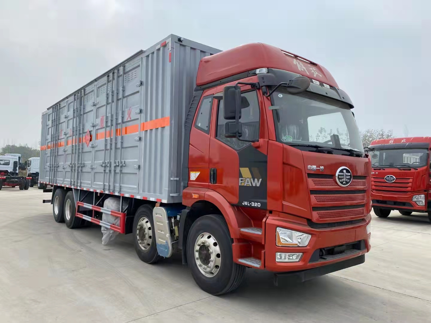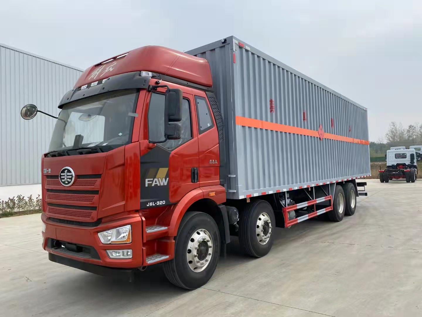 解放前四后八國六瓦楞板危險品車采用的是新J6L全浮高頂排半駕駛室、液晶儀表、電動玻璃升降、電動后視鏡、側圍網兜、后圍窗簾導軌、全景窗簾導軌、駕駛員座椅為空氣減振座椅、單DIN北斗兼容車載系統、電源總開關控制開關,大柴CA6DK1-32E61(EGR+DOC+DPF+SCR、雙腔空壓機、發動機制動),變速箱CA10TA130M變速器(全鋁殼體),車橋ф435沖焊橋(進口ABS、1878輪距、2孔V桿),速比3.727,12R22.5型18層級輪胎(輕量化輪輞、雙錢花紋RR100/朝陽花紋AS578/正新花紋CR260),270×75×(7+5),自動空調、前下防護裝置、駕駛室四點螺簧懸置、一體式寬體保險杠、電動液壓舉升裝置、后懸2500mm、車輛限速、排氣火花熄滅器、整車配備靜電拖地帶1根、駕駛室帶2kg干粉滅火器1個、懸架3/3/-(8氣囊)、排氣尾管及消聲器前置、前盤后楔式制動器、右轉彎音響提示、爆胎應急安全裝置、安全帶佩戴提醒、制動襯片更換報警、鋁油箱300L、T-box1.5、U型后處理、EBS+ESC、單胎帶TPMS(胎壓監測)、鋁貯氣筒、LDW+FCW、天線操縱、排氣節流閥、AEBS(自動緊急制動)。軸距1900+4500+1350mm。