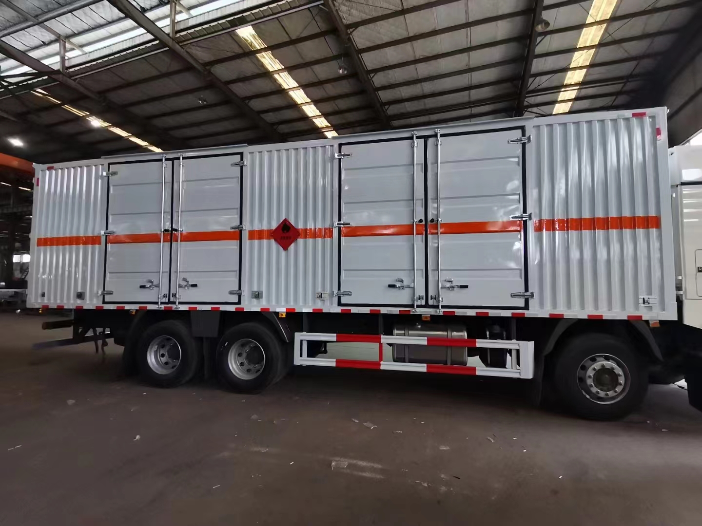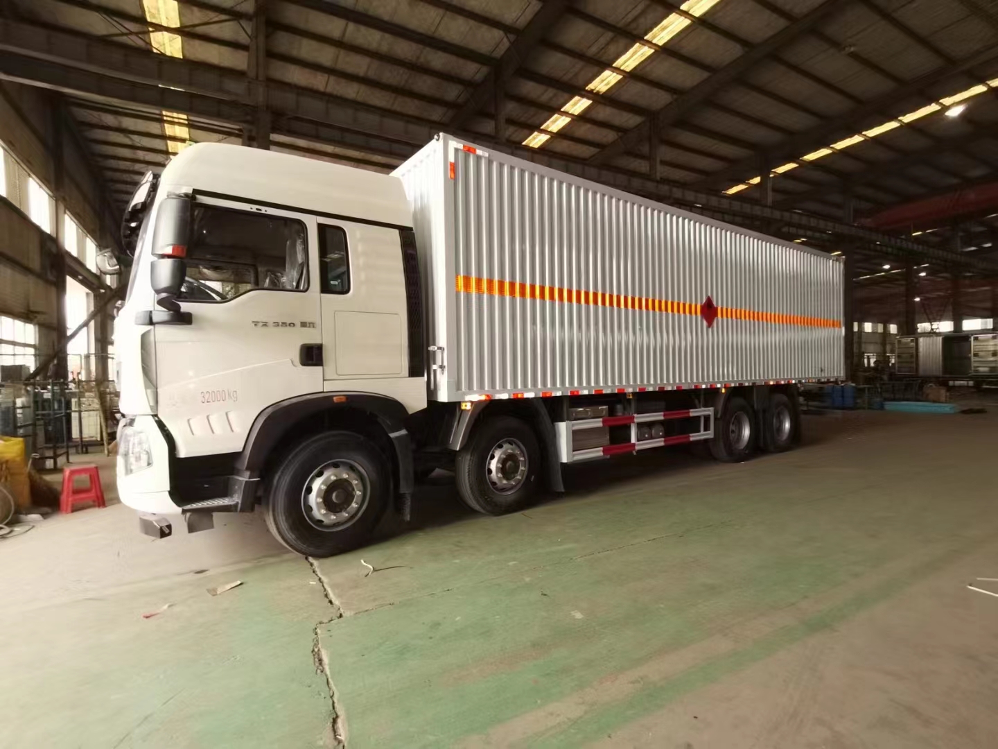汕德卡國六前四后八瓦楞板危險品車采用的是汕德卡 G5高頂雙臥駕駛室;MC07H.35-60發(fā)動機;HW13709XSTC2變速箱;VPD75D前軸(盤);MCY11BGS自調(diào)臂雙后橋(鼓);速比4.63;雙層車架(8+4/280);前少后空氣懸架(3/3/-/-);博世方向機;前置排氣系統(tǒng);AEBS(EBS+ESC);高位保險杠(全金屬),295/80R22.5;400L油箱;LDWS+FCWS;中國重汽智能通B版;電磁式電源開關(guān);轉(zhuǎn)向輪爆胎應(yīng)急裝置;