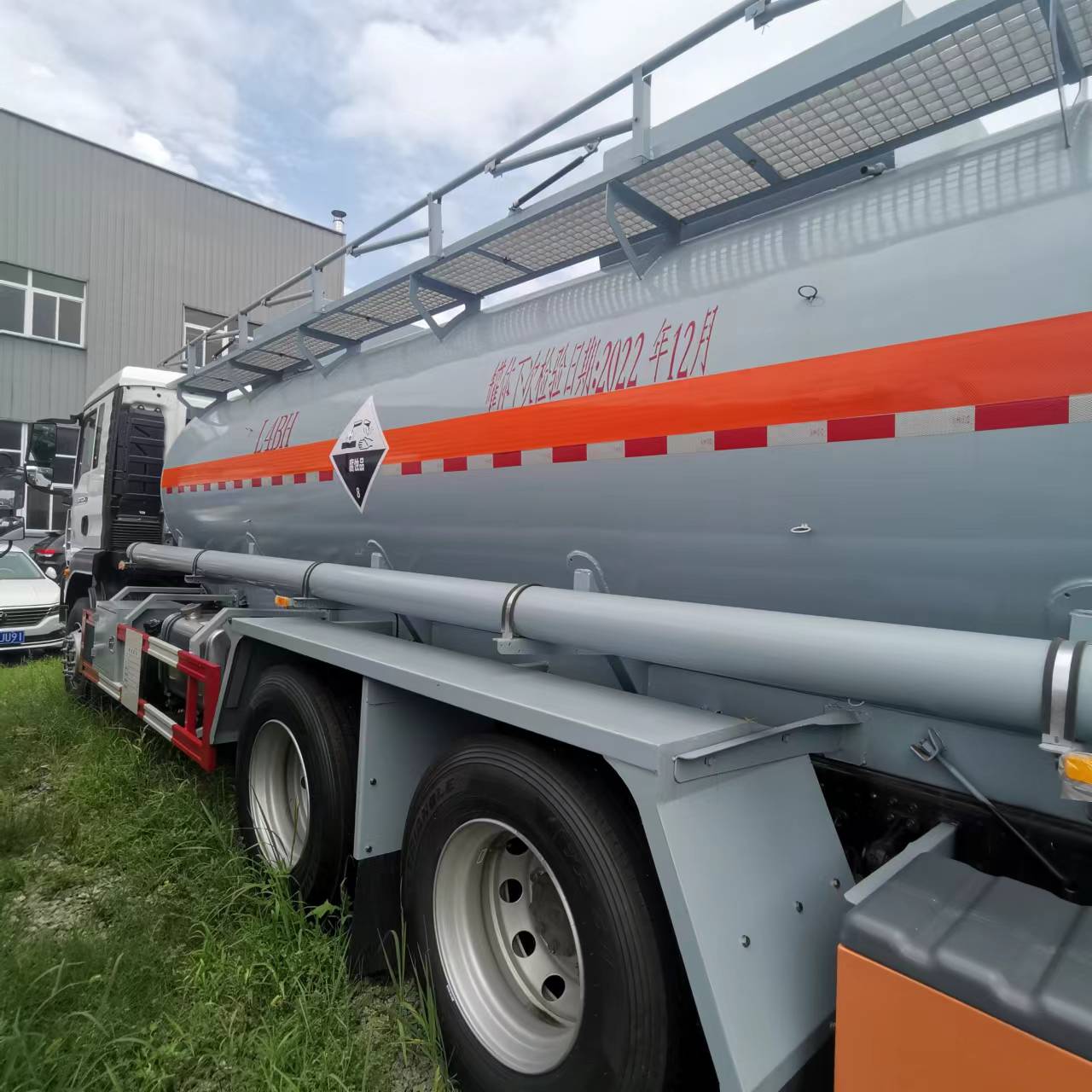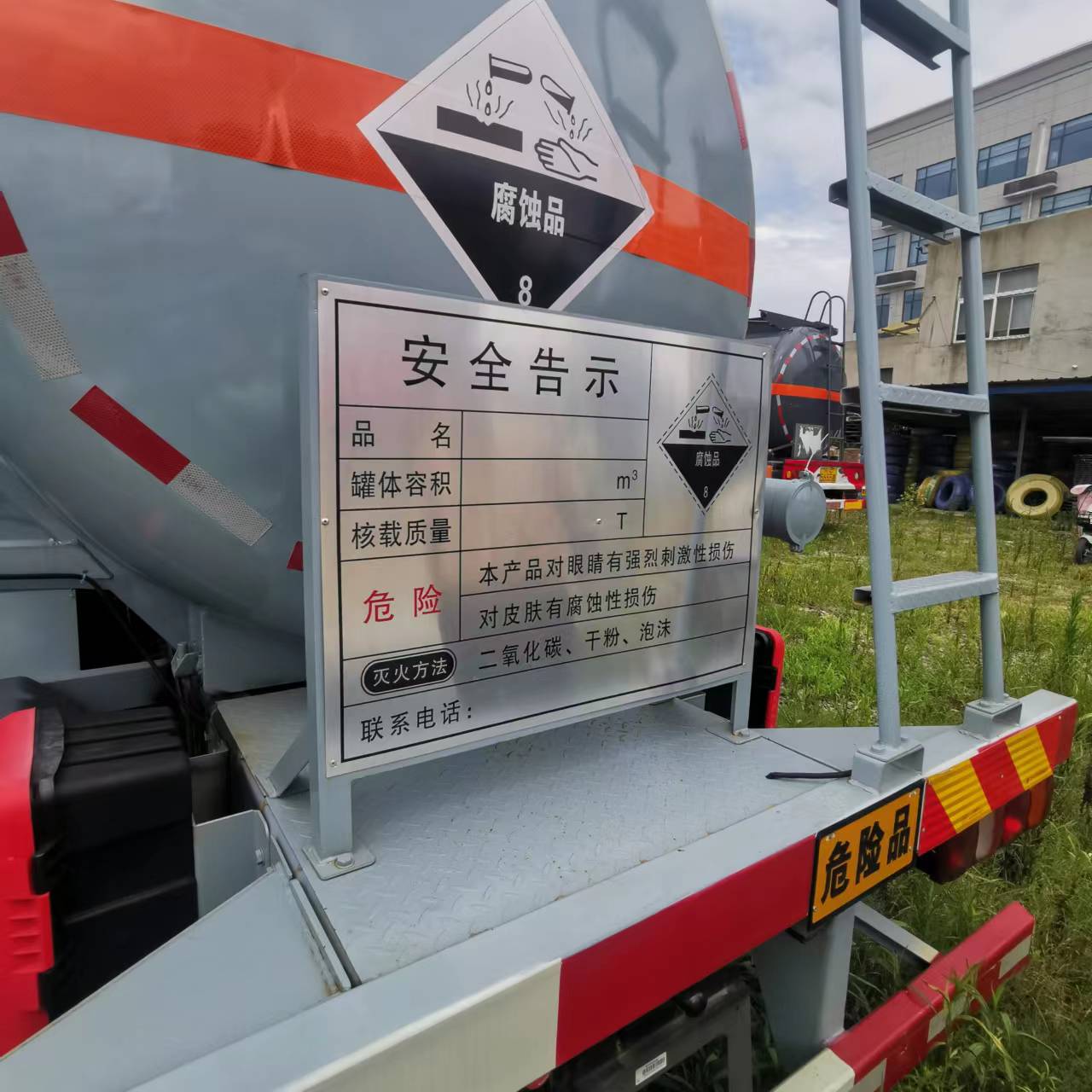 汕德卡國六后雙橋腐蝕品罐式車罐體通倉,內襯聚乙稀塑20mm厚,一個歐標罐口帶全塑接酸盤,罐體頂部帶方盒子式上圍板,圍板內做重瀝青防腐。罐體尾下部帶一個DN100型不銹鋼襯四氟海底閥(海底閥帶聲光報警裝置),罐體尾部左右大梁下各一個自流口,用DN80型襯氟球閥控制帶外購全塑保護箱,不銹鋼升降護欄,花紋板走道,后爬梯,一個工具箱,兩個8KG滅火器,兩根PVC鋼絲軟管并帶PVC塑料炮筒管。其余按廠家標配。
