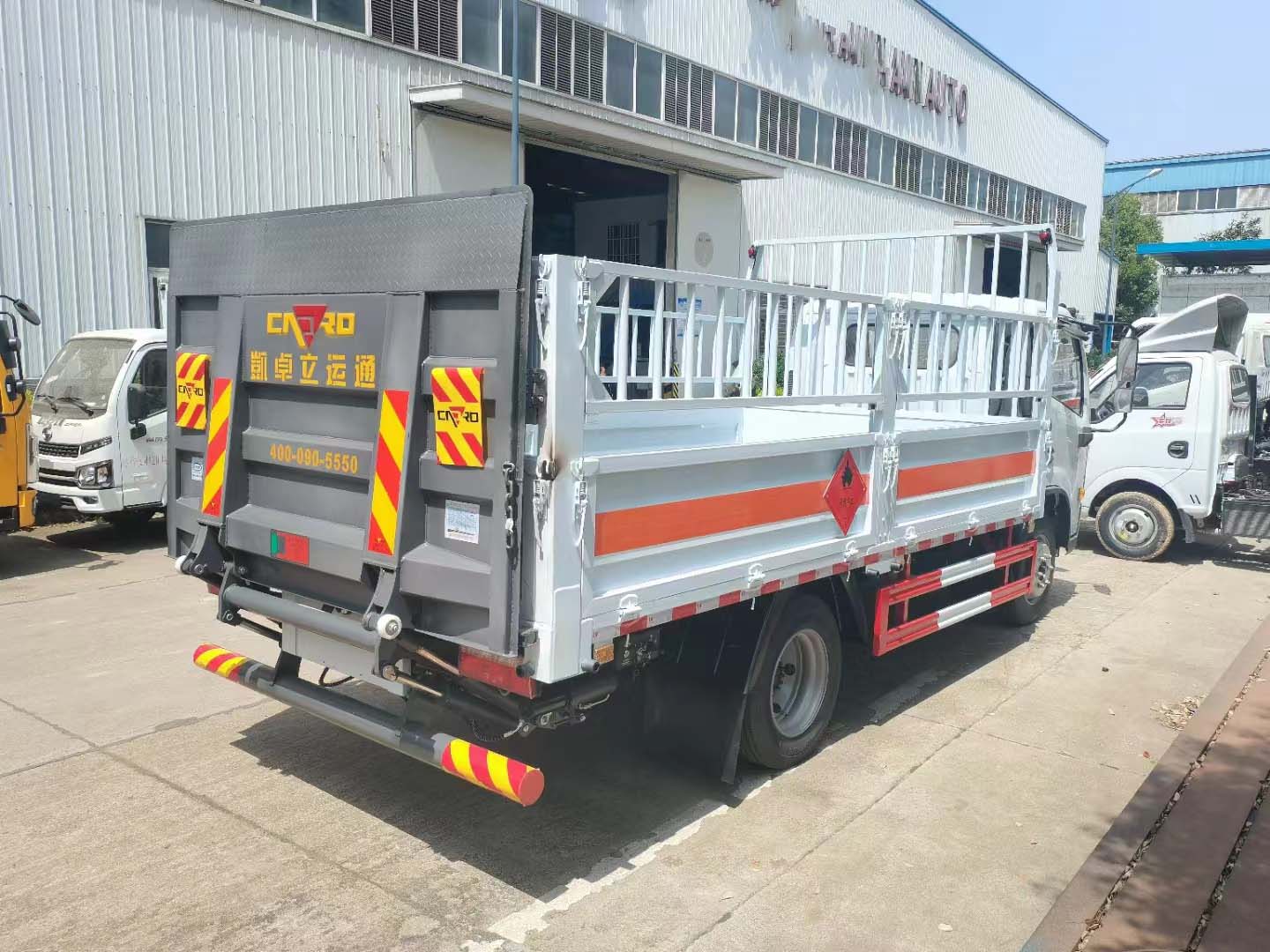 提到該款車型的重點在于該車額載大,同類型車中該車額載可達7.7噸,客戶拉重貨不用擔心超重的問題。東風福瑞卡國六4米5氣瓶車采用的是東風危險品專用底盤,云內150馬力發動機,廂體尺寸4500*2300*550mm。2030mm寬新款單排駕駛室,188雙層大梁,萬里揚6檔變速箱,245真空胎,前橋2.7噸,后橋5.5噸,帶原廠空調、中控鎖、電動門窗、防爆胎應急裝載,車廂采用的是冷板等鋼材焊接而成的高欄結構,高欄活動可拆卸,兩側欄板下翻轉,后部欄板下翻轉,欄板內兩側可選卡槽,前龍門架齊全,鋪設防靜電膠皮,箱體采用的是橙色反光帶、紅白相間反光板,安全告示、滅火器。