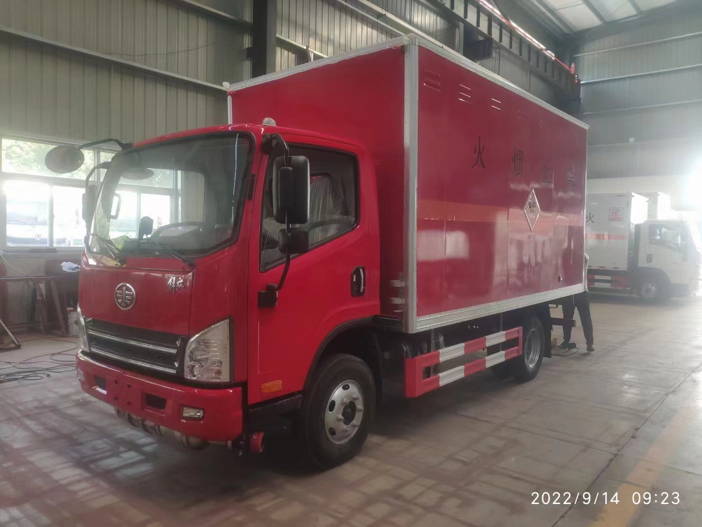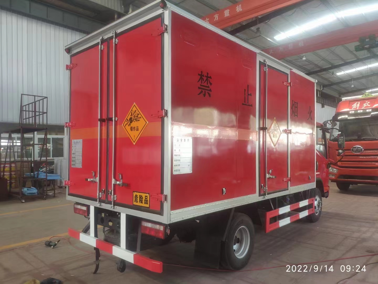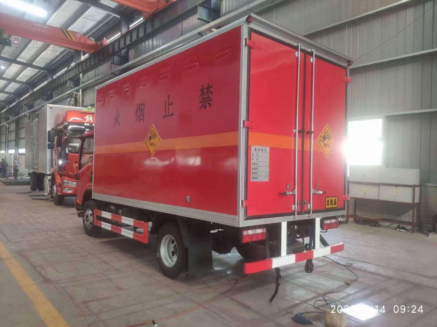 解放虎V國六紅色危險品車采用的是解放危險品車專用底盤,錫柴130馬力發動機,帶中控鎖、電動門窗、原廠空調,寬體3人座,該車配置有多功能方向盤,為了讓長途運輸更方便,該車采用的是120L油箱,7.00R16真空胎,帶后處理器前置、排氣火花熄滅器、前盤后鼓制動器。帶北斗+GPRS行車記錄儀,爆胎應急安全裝置,帶靜電拖地帶,原廠危險品專用底盤。根據客戶要求定制的紅色,整車看起來更醒目別致。箱體全部采用的是防阻燃材料,外冷板內鋁板,中間夾防阻燃材料,專為防爆車設計,采用的是防靜電處理。該車箱體容積可達17立方,貨箱寬度可達2米1,該車側門可選單開側門,也可選雙開側門,根據裝載貨物不同,該車可選擇不同的樣式。