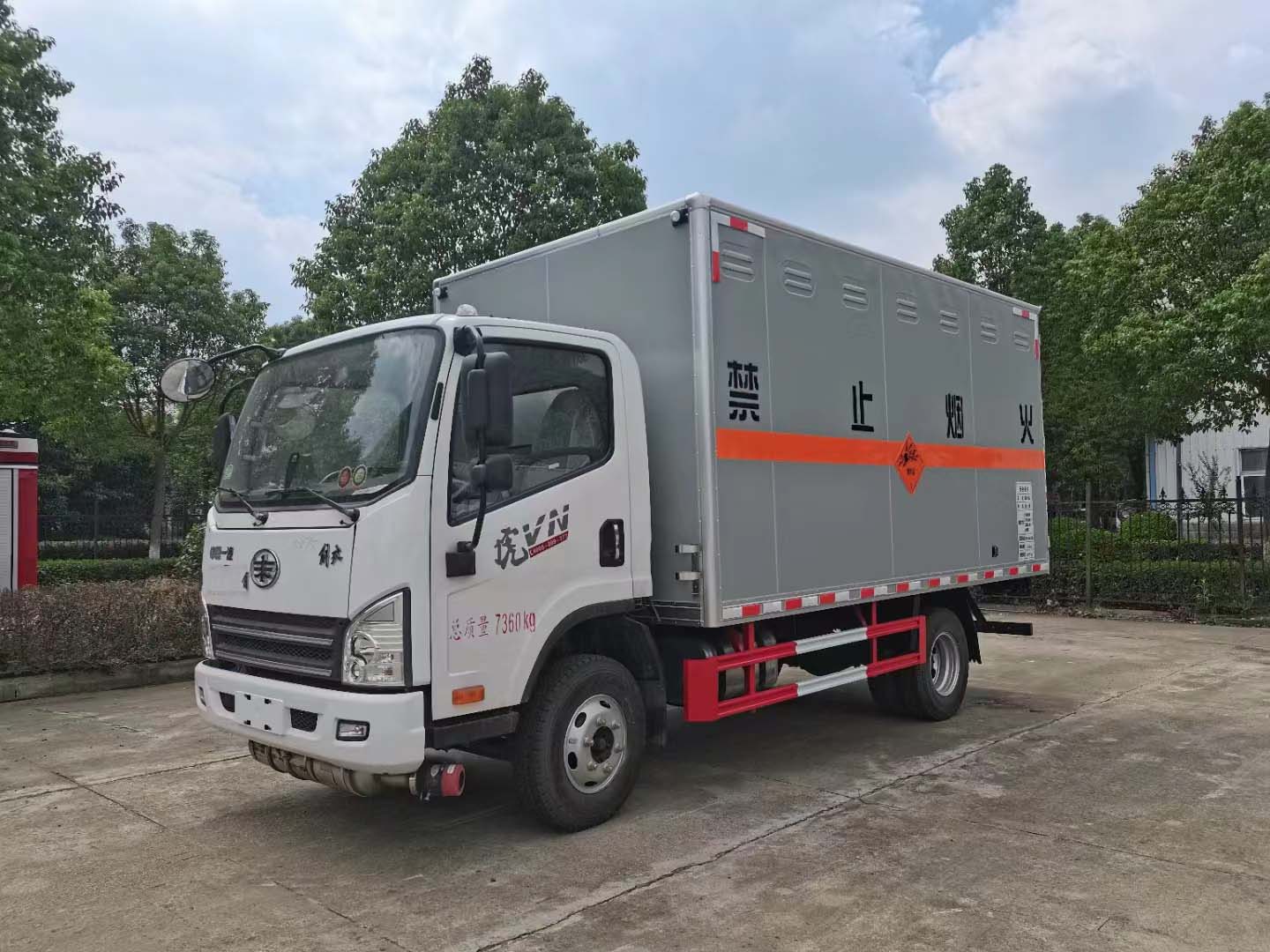 解放國六4米2黃牌爆破器材運輸車根據客戶喜好,選用的是經典虎VN平頂單排駕駛室,濰柴WP2.3NQ130E61馬力發動機,7.00R1614層級真空胎,多功能方向盤,板簧3/7+9,定速巡航,帶國產ABS,高架箱,空調+電動門窗+中控鎖,后處理器前置+排氣火花熄滅器+前盤后鼓制動器+限速79KM/H,北斗+GPRS行車記錄儀,爆胎應急安全裝置,帶靜電拖地帶,廂式危險品專用底盤.整車尺寸5995X2350X3090,廂體內部尺寸4150X2200X2000,右側中開單側門,廂體生產工藝采用可產生靜電屏蔽效應的冷扎鋼板,中間為B1級阻燃泡沫,內飾鋁板。底板為平板上鋪防靜電膠皮。后部帶防盜報警器,頂部帶煙霧報警器。