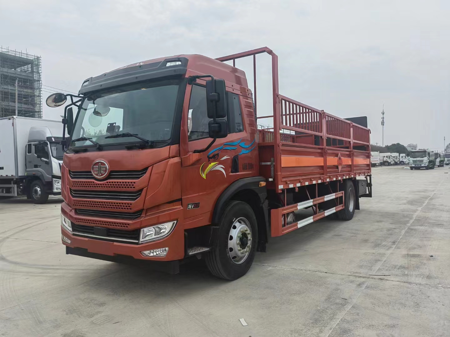 解放龍V國六6.8米氣瓶運輸車整車尺寸:9000× 2550×3200mm,廂體尺寸:6750×2450×600mm, 該車嚴格按照公告尺寸制作,底板采用5MM花紋板,底板上鋪靜電膠皮,帶可卸式高欄(瓦楞式欄板),配備滅火器,三角頂燈,靜電拖帶等,嚴格按照國家危險品法規進行“易燃氣體”標識粘貼等.