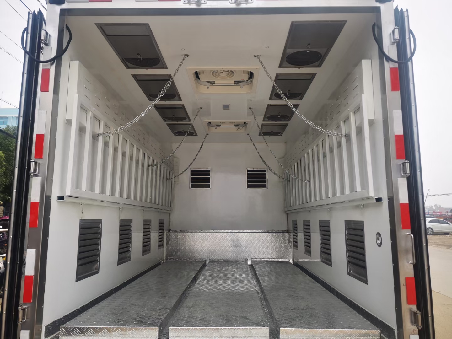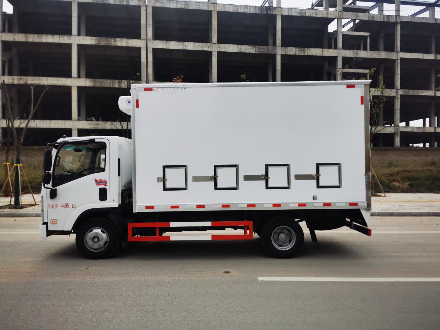 五十鈴KV100 國六藍牌雞苗運輸車廂體采用內外玻璃鋼板,中間8CM保溫板,鋁花紋底板,廂體前板2個百葉窗,尾門各加裝4個電子扇(帶滑門),廂體兩側下方各裝4個百葉窗(帶小門可開啟),廂體頂部安裝2個天窗,天窗兩邊各加裝4個電子扇,底板通風道,廂體兩側安裝貨架,加裝加熱器和制冷機組。