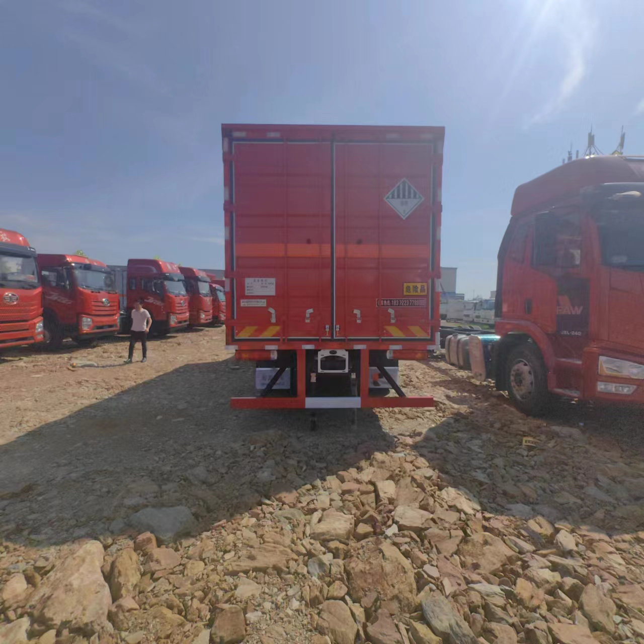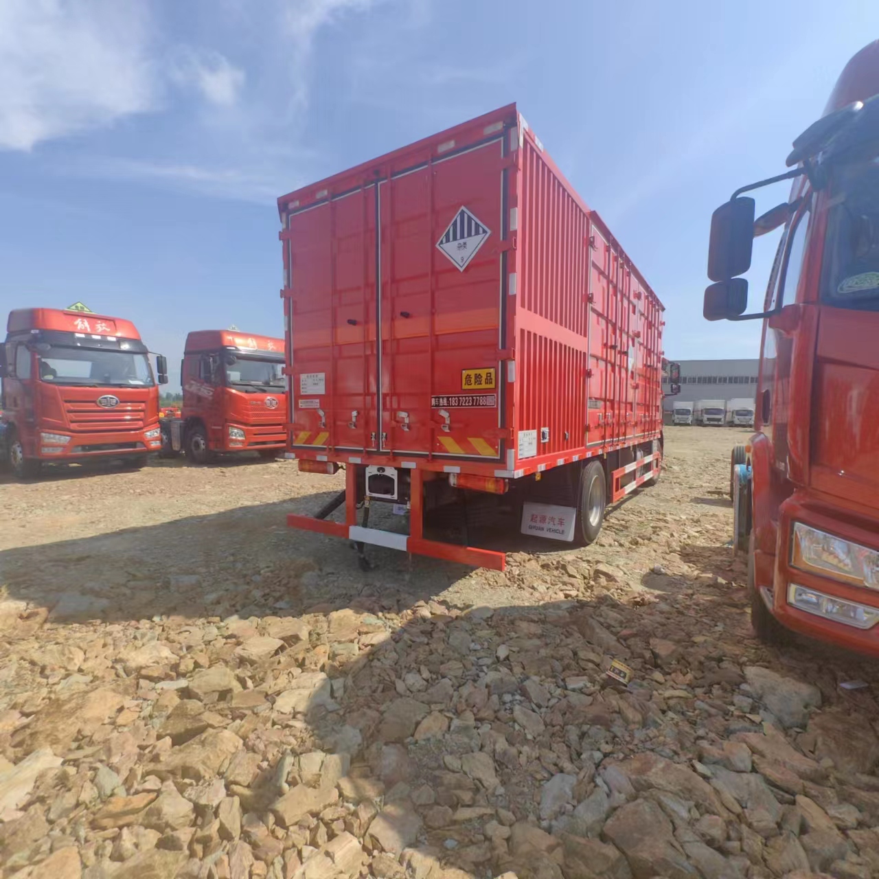 解放J6L國六帶左右開門瓦楞板危險品車廂體采用1.2毫米厚瓦楞板折彎而成的箱體,車廂底板鋪4毫米厚花紋板,車廂底板鋪防靜電膠皮,隨車帶兩根接地防靜電膠帶和兩個2公斤滅火器。箱體匹配的是左右開門。方便客戶裝卸貨物。尾部可加裝液壓尾板,整車不超重。