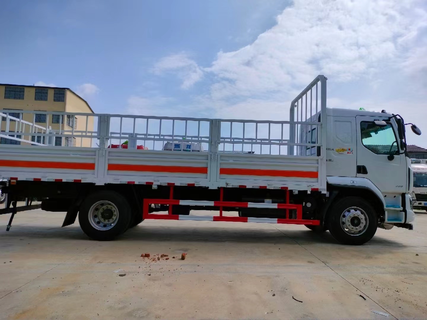 柳汽乘龍6.72米國六氣瓶車廂體尺寸:6720×2430×600mm。嚴格按照公告尺寸制作,底板采用5MM花紋板制作,帶可卸是高欄,配備滅火器,三角頂燈,靜電拖帶等,嚴格按照國家危險品法規(guī)進行“易燃氣體”標識粘貼。