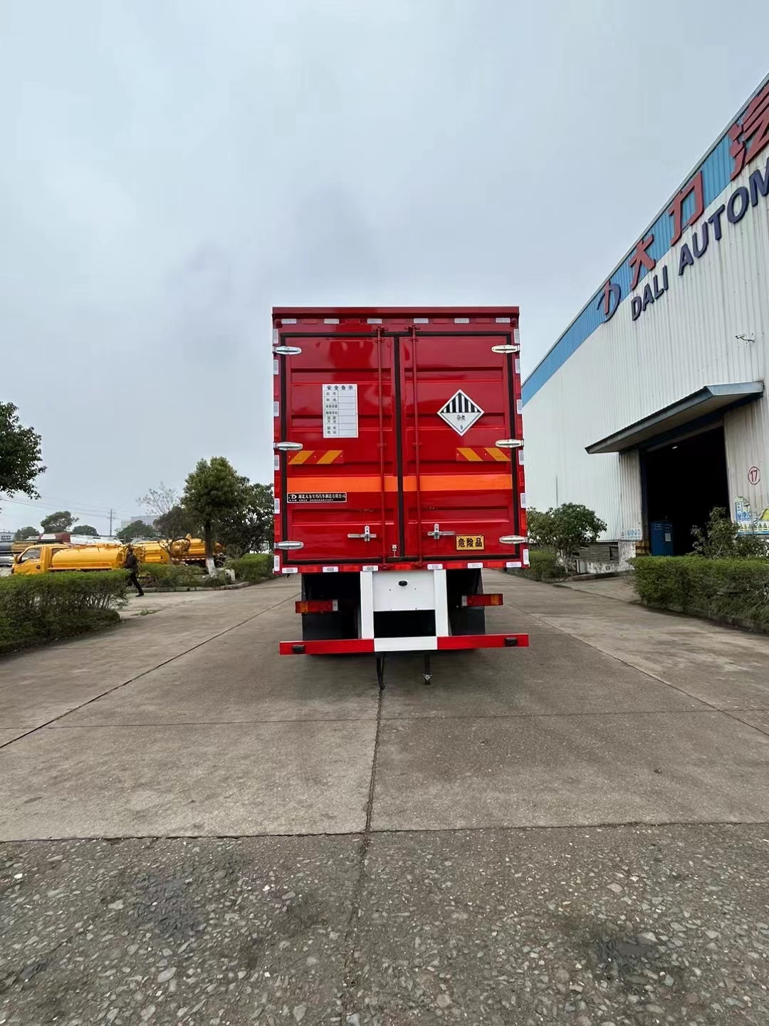 東風(fēng)天龍紅色前四后八國(guó)六瓦楞板危險(xiǎn)品車選用的是D320高頂雙臥駕駛室,康明斯400馬力發(fā)動(dòng)機(jī),陜齒12JSD180TA變速箱,前橋5.5噸,后橋10噸,速比:.4.875,選用的是295/80R22.5輪胎,外形尺寸:12000*2550*3980mm,廂體內(nèi)尺寸:9400*2450*2500mm,為了讓裝載噸位更大,該車選用的是瓦楞板結(jié)構(gòu)箱體,選用的是右側(cè)全開門形式,定制的是整車紅色, 車輛看起來更大氣美觀。
