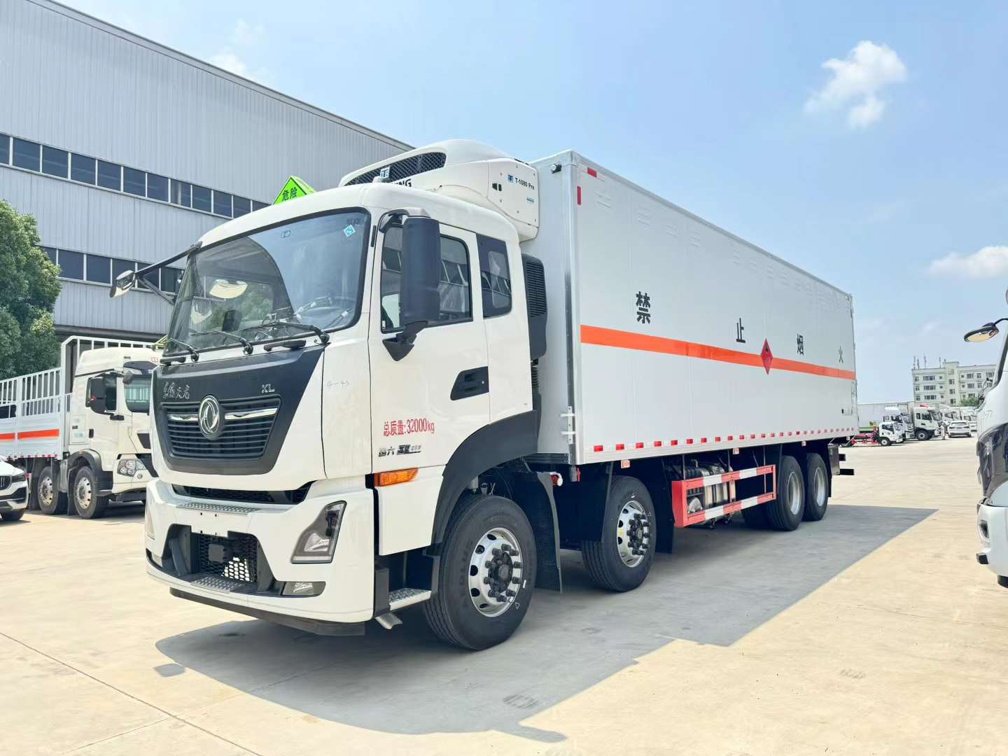 東風天龍國六前四后八帶冷機危險品車選用的是危化品專用底盤,可選350馬力發動機和400馬力,箱體選用的是帶保溫功能的危險品箱體,外觀美觀,防爆性能安全可靠,采用的是導靜電底板,箱體選用的是熱鍍鋅工藝骨架,從內到外部會生銹。所有脛骨劍全部是定制型的,堅固耐用。車輛全部用的是組合型無縫對接包角,防漏水性能好。