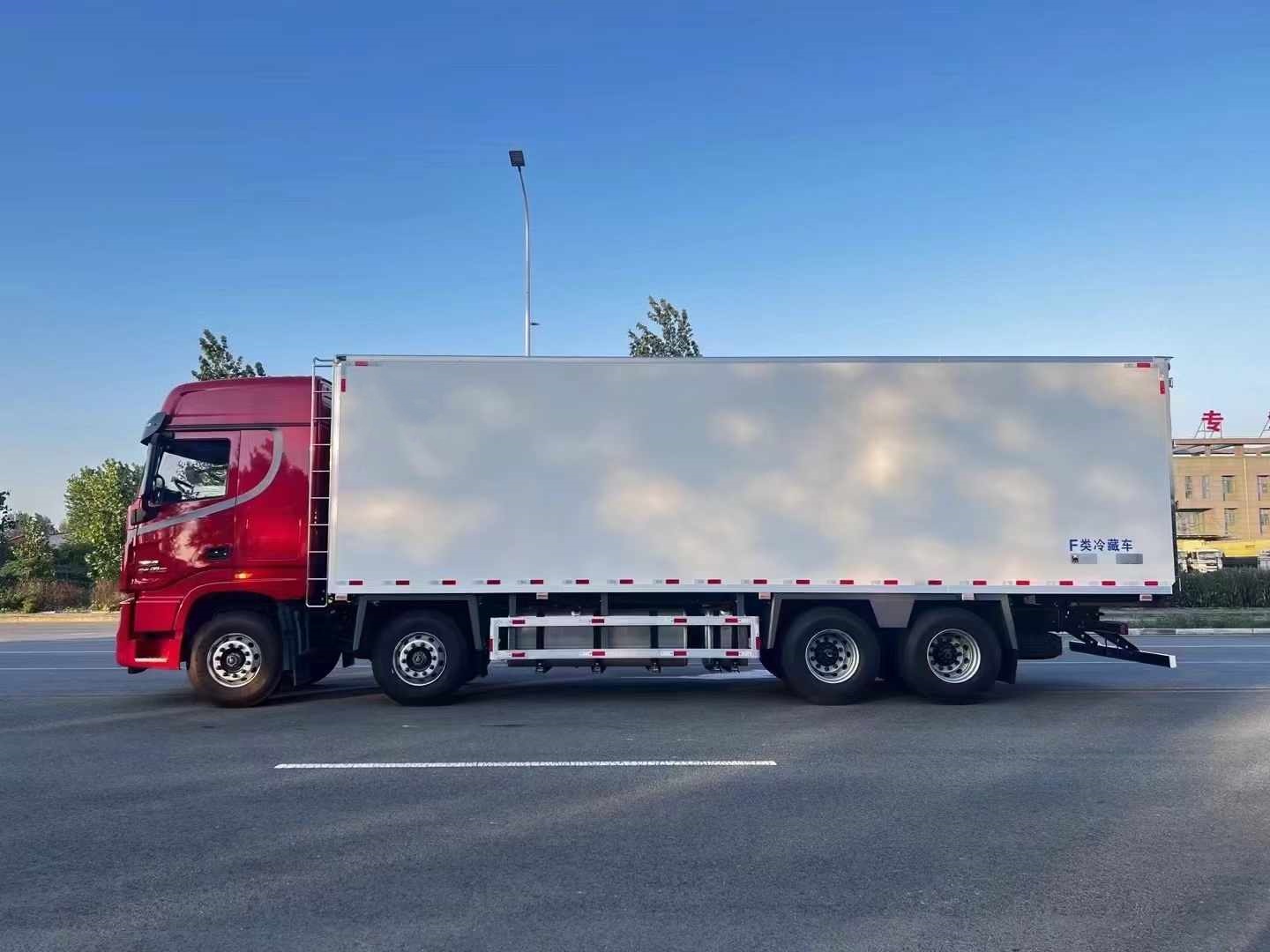 東風天龍KX旗艦版國六冷藏車貨箱全部采用新式的工藝,采用內外玻璃鋼,中間8CM高級保溫材料填充,箱體后雙開門,廂體右側單開側門,前部兩個排水孔,底部采用鋁花紋底板,門邊條采用迷宮式橡膠密封條,鋁合金型材包邊,不銹鋼包角,不銹鋼門鎖,不銹鋼門框及合頁,廂體內節能LED照明燈,箱體內直角包邊。因為是長途跋涉又需要走高速,所以車輛輕量化設計更適合,箱體右側可以加裝多種開門形式,尾部可加裝液壓尾板,整車不超重。