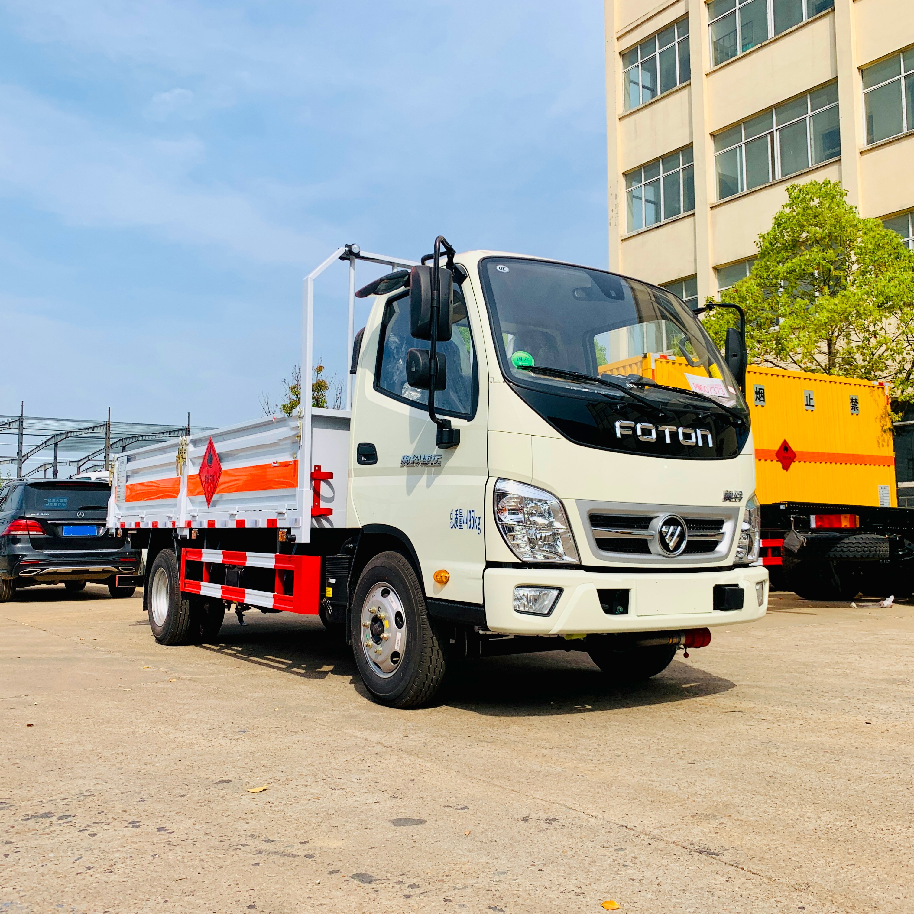 福田奧鈴國六藍牌氣瓶運輸車廂體邊板采用瓦楞結構,底板上方鋪防靜電膠皮,選裝可拆卸高欄,活動立柱,底板做防銹處理。箱體采用雙組份丙稀酸油漆制作,所有合頁均為熱鍍鋅材質。選裝液壓升降尾板。整車國標反光標示及警告標志 (隨車工具,滅火器,三角頂燈,危險品標識,拖地靜電帶),其他按照公告標準制作。