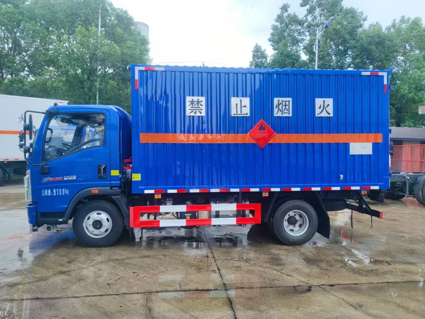 重汽5噸藍色國六易燃氣體廂式運輸車選用的是危化品專用底盤,濰柴130馬力發動機,寬敞3人座,新款駕駛室,根據運輸要求,很多危險品車要區別開,所以定制的顏色與常規的顏色不一樣。貨箱選用的是冷軋板折彎而成的瓦楞板,右側帶側開門,尾部帶后尾門。為了防靜電,底板鋪設靜電膠皮,該車定制的是整車藍色,尾部可加裝液壓尾板,整車不超重。