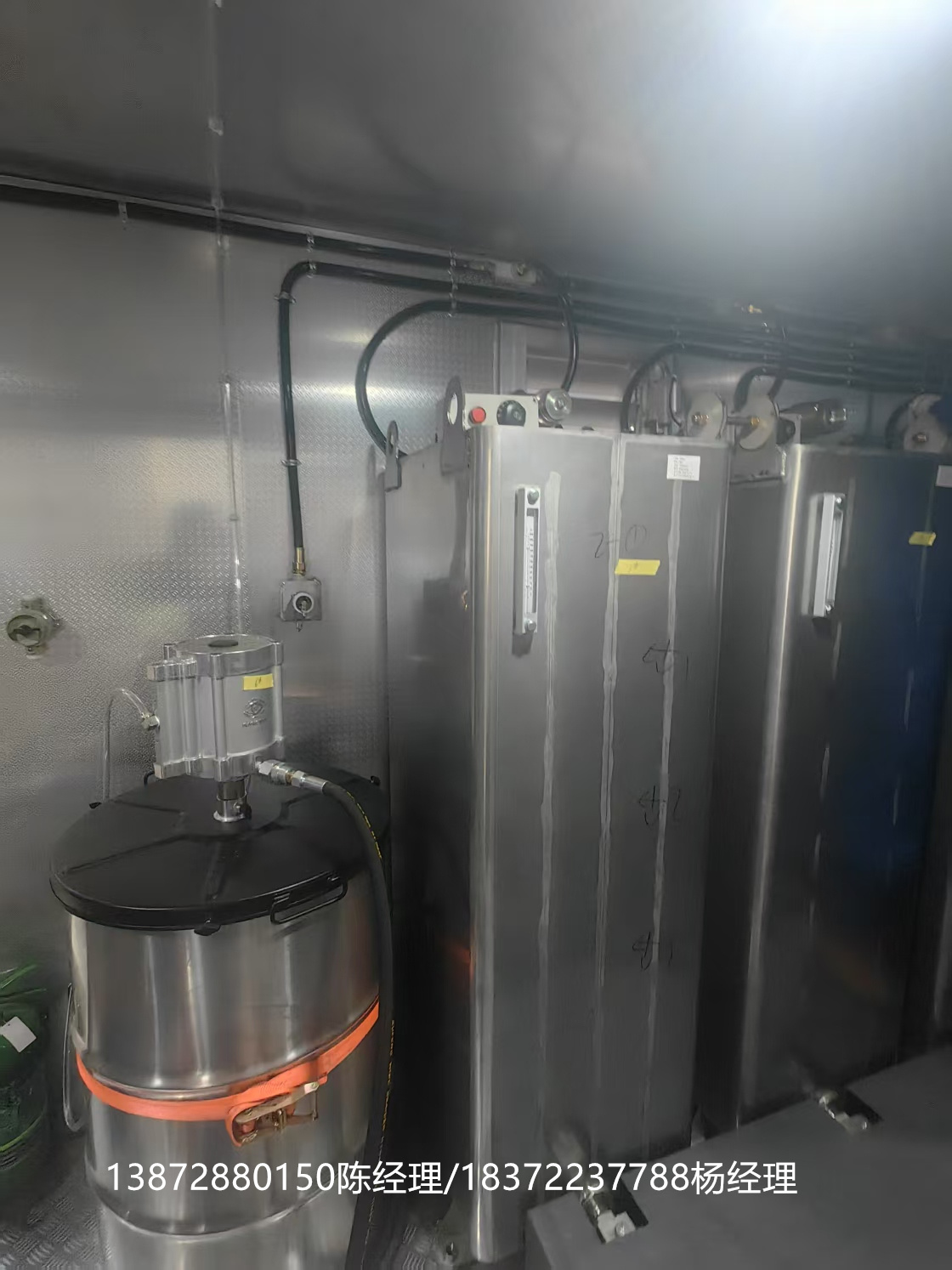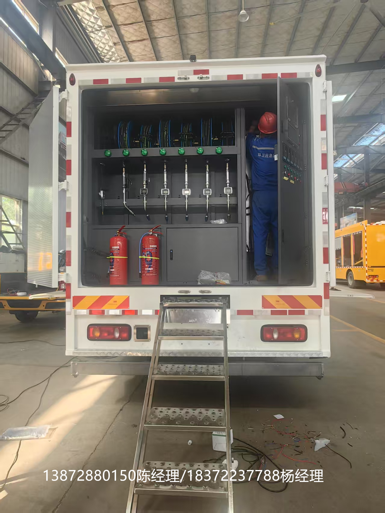 礦山專用移動加注檢修車選用的是我司專用的底盤。可選康明斯230馬力或者龍擎240馬力發動機,根據路況進行選擇不同的發動機進行選擇。箱體選用的是防阻燃的箱體,內部全部采用的是靜音隔膜材料。為的是更方便快捷地進行檢修。車廂內設備齊全,全部采用的是智能化設備,帶專用的加油罐體,通過了第三方檢查,用車更安全省心。