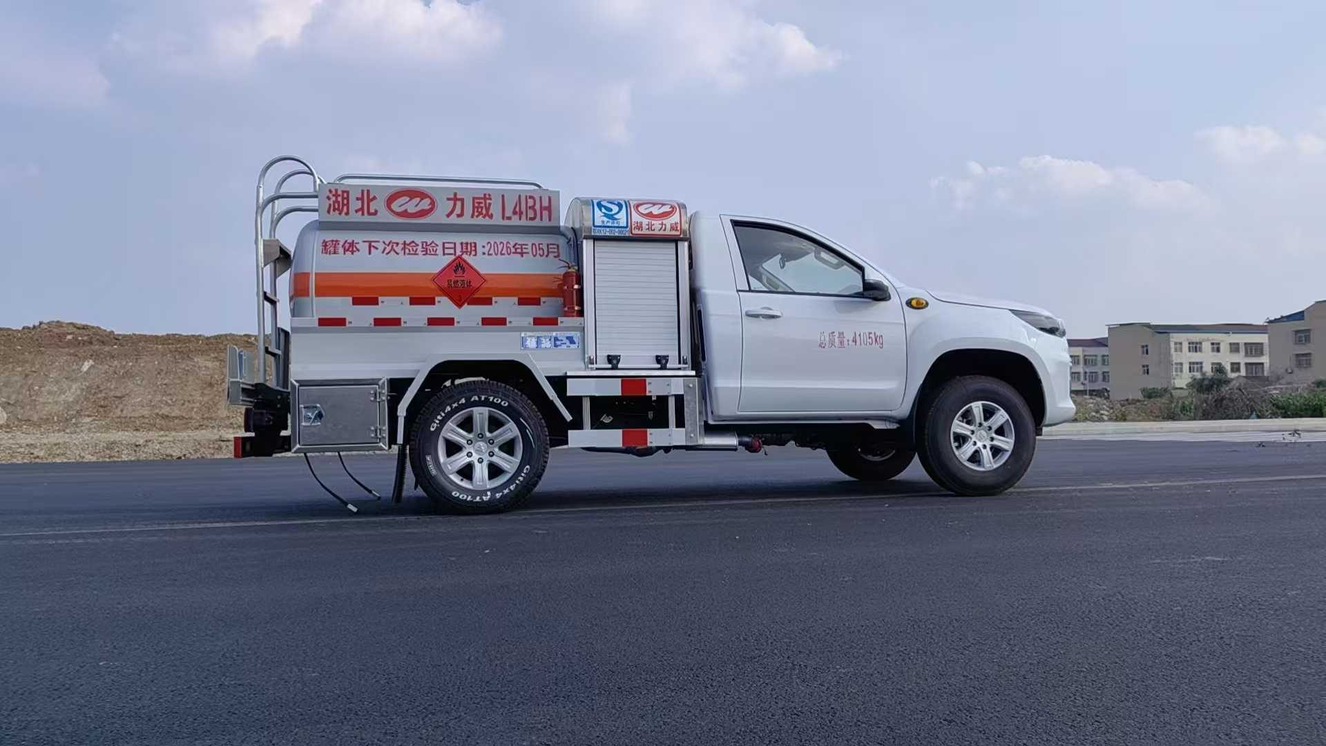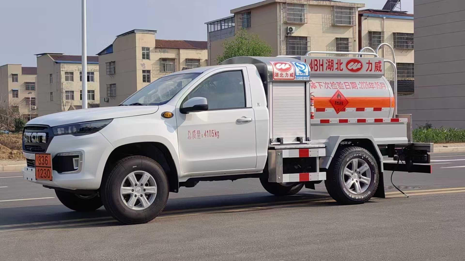 福田皮卡四驅國六油田專用注醇車罐體介質為甲醇, 嚴格按公告尺寸及外型制作,罐體采用304不銹鋼,一個不銹鋼普通罐口,帶安全閥和爆破片,不銹鋼泵,泵進泵出口在側中部,管道球閥出口均為不銹鋼,一個不銹鋼海底閥,與液體接觸部位為不銹鋼,海底閥5公里駕駛室語音提醒,鐵制折疊護欄,鐵制炮筒管,后爬梯,一個工具箱,兩具鐵制滅火器桶,靜電拖帶,兩根與管道箱同長的輸液管及快接頭,兩具滅火器,罐體顏色銀灰色,貼反光帶,反光條,罐體左、右、后貼3個“易燃液體標識”。