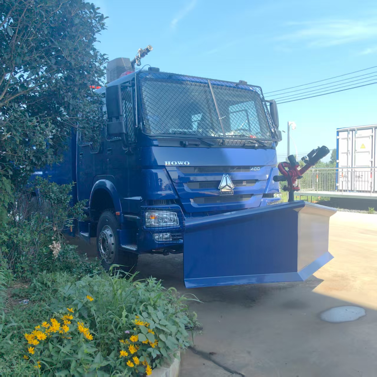 重汽豪沃避障維和治安車選用的是后雙橋底盤或者單橋底盤,可選多款發動機,該車用于維和治安,所以車輛所有涉及窗戶的地方全部采用的是防護網設計,車輛前部帶避障鏟,帶防爆消防水泵,可以進行水霧水噴灑,頂部帶高炮可灑泡沫或者辣椒水。采用的是遠程電動控制,所有管道全部采用的是不銹鋼控制。罐體容積可定制,根據高炮的設計定制有專用的管道。