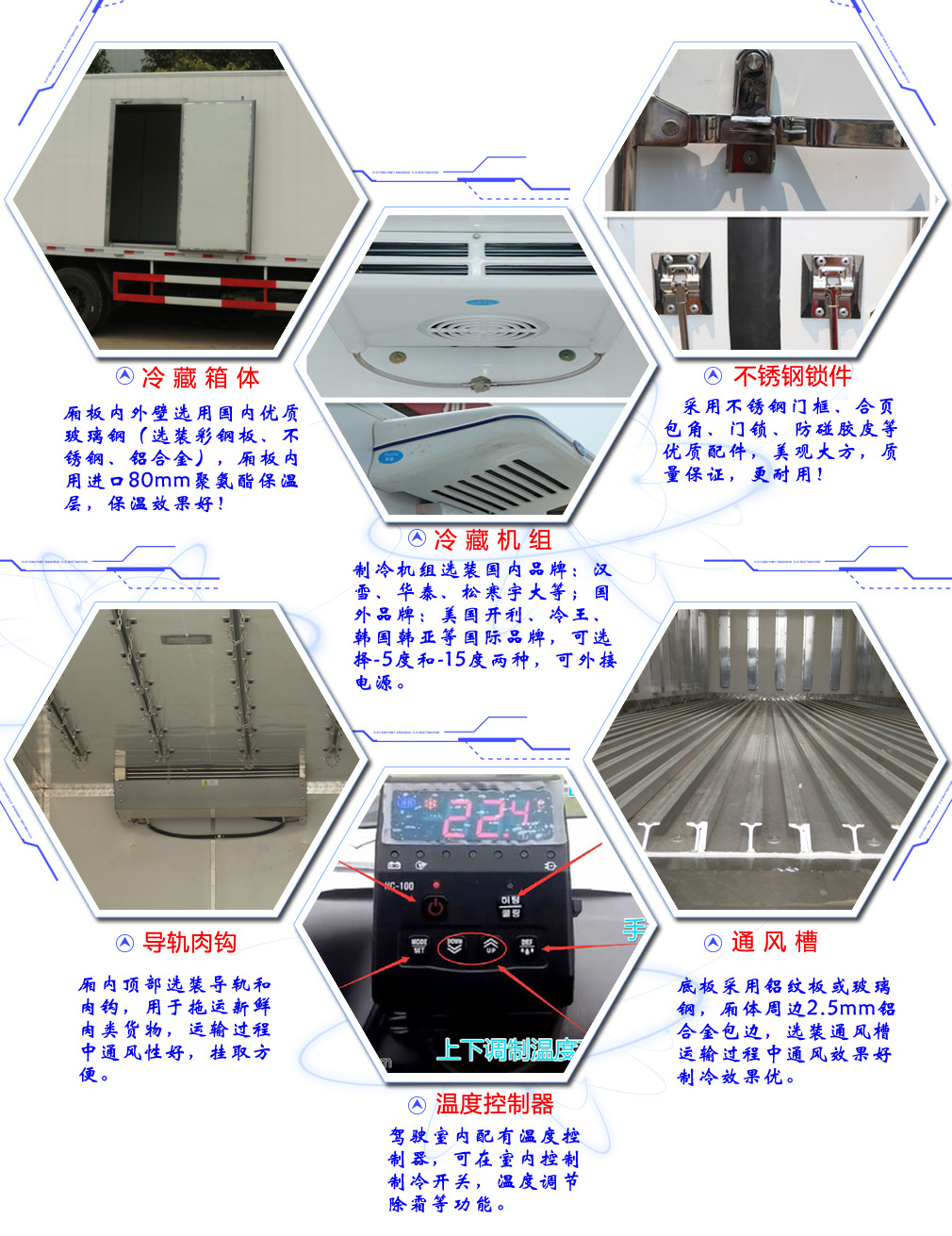 廂體配置:貨廂尺寸:3735×2350×2300/3735×2100×2100,廂體材質為內外玻璃鋼,8cm高密度聚氨酯保溫,底板為防滑花紋鋁板,后門鎖件為不銹鋼。